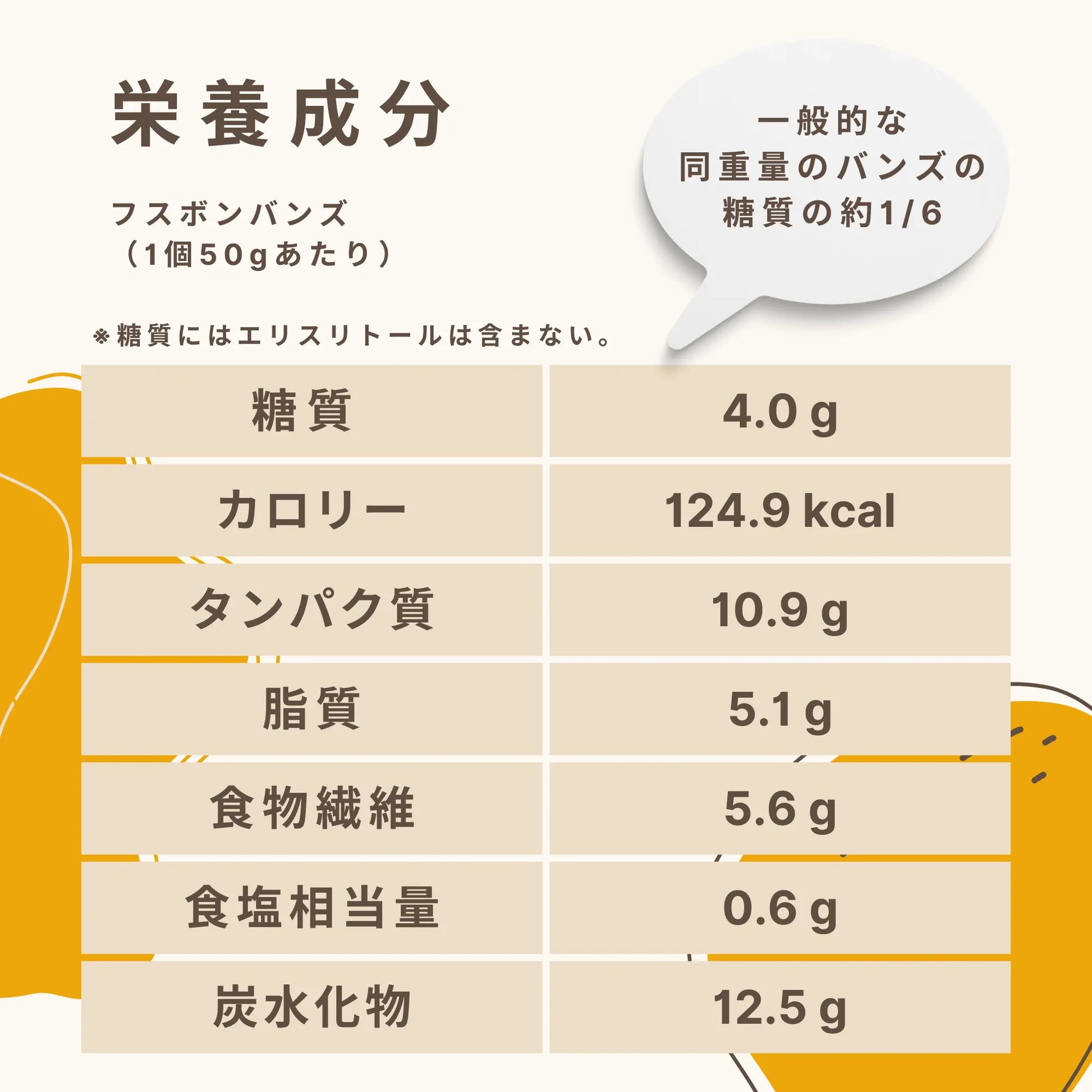 フスボンバンズは、フスボン独自の低糖質ミックス粉を使用し、1個あたりの糖質をわずか4.0gに抑えた本格バンズです。