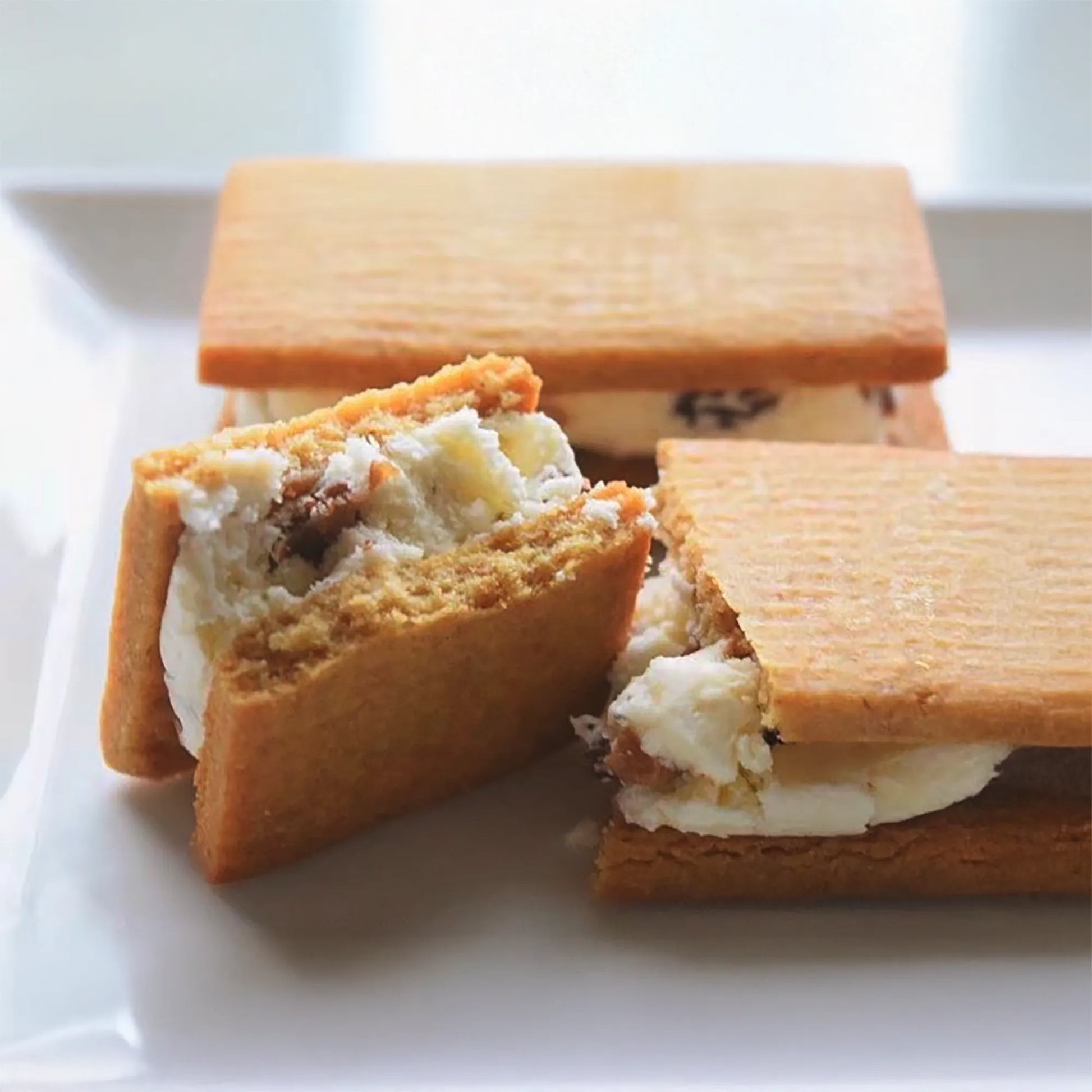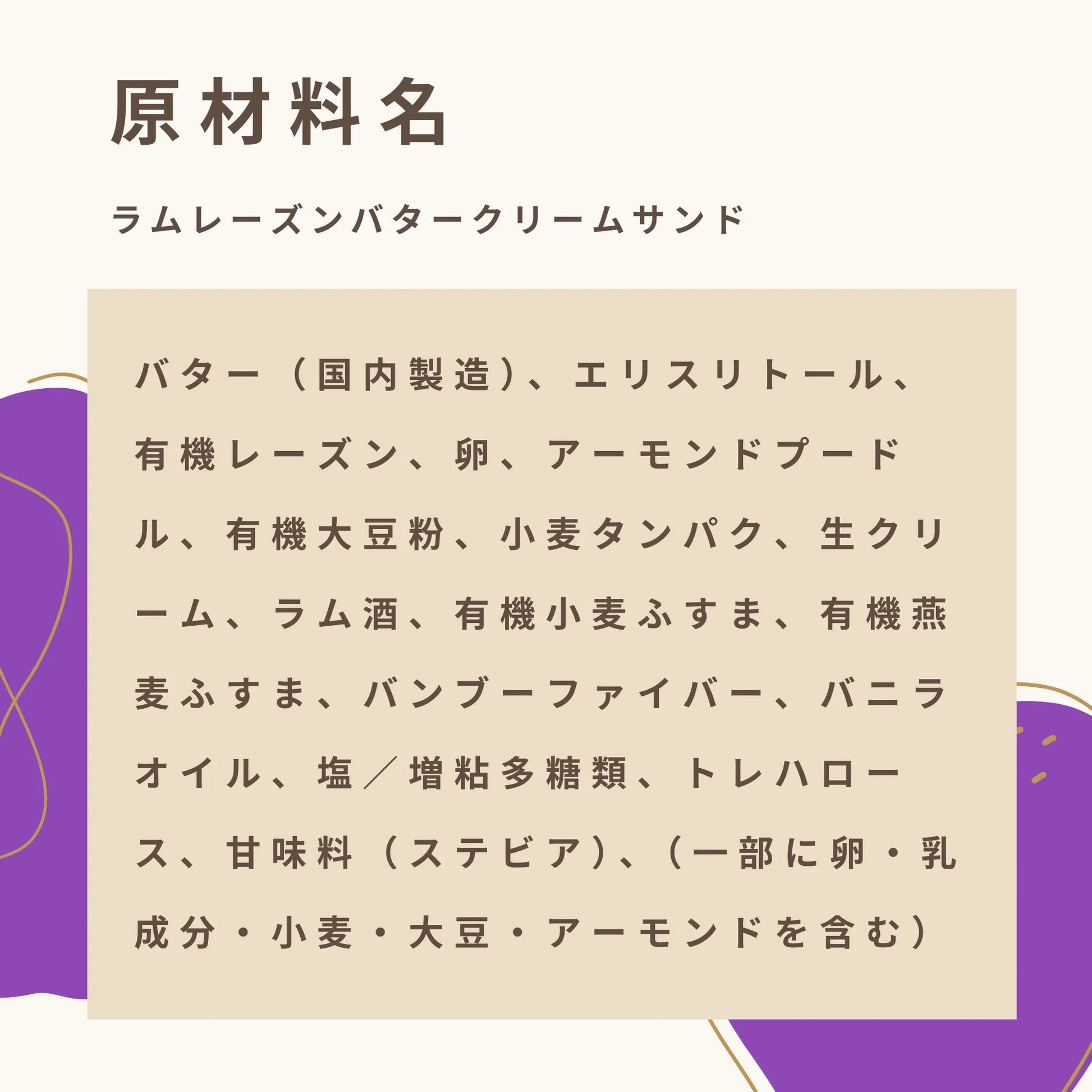 ラム酒に漬けたレーズンと天然甘味料で甘味をつけた生クリームとバターからなるクリームをフスボンクッキーでサンドしたおやつです。