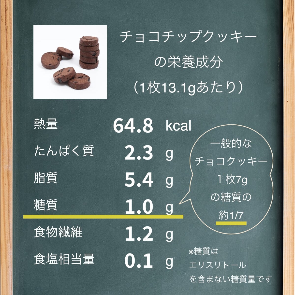 糖質1.0g、カロリー64.8kcal、タンパク質2.3g、食物繊維1.2g、脂質5.4g、食塩相当量0.1g、炭水化物4.8g(推定値・糖質はエリスリトールを含まない)
