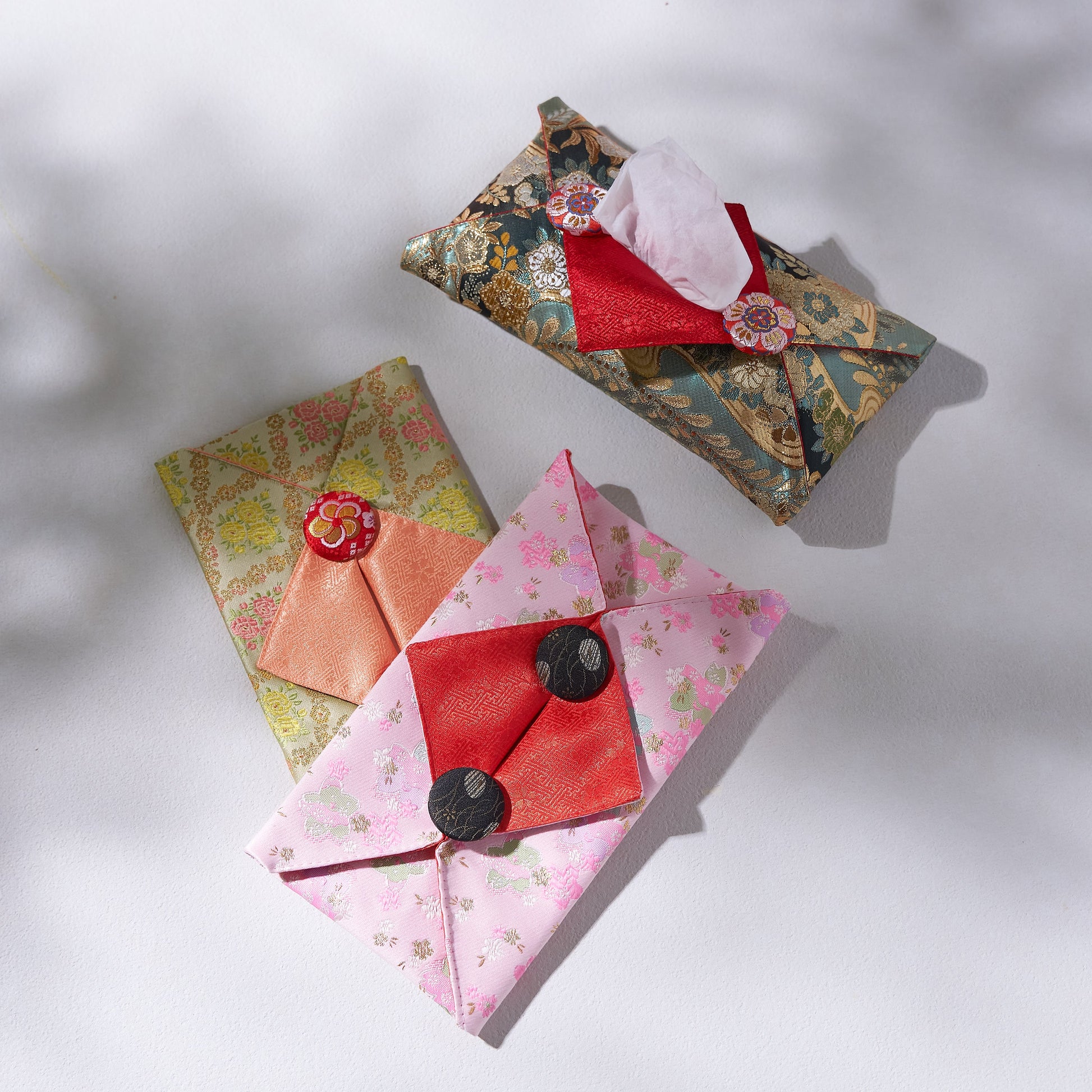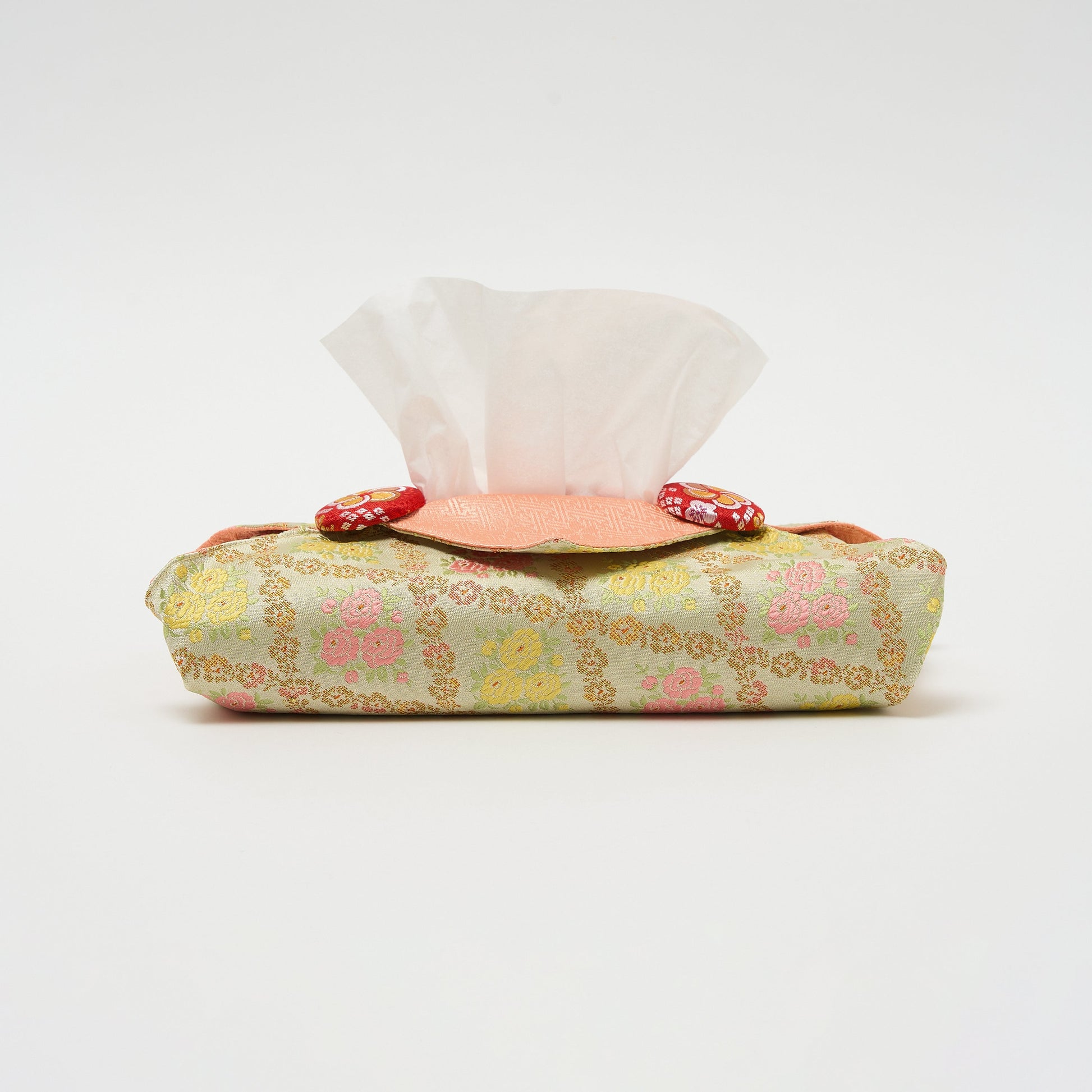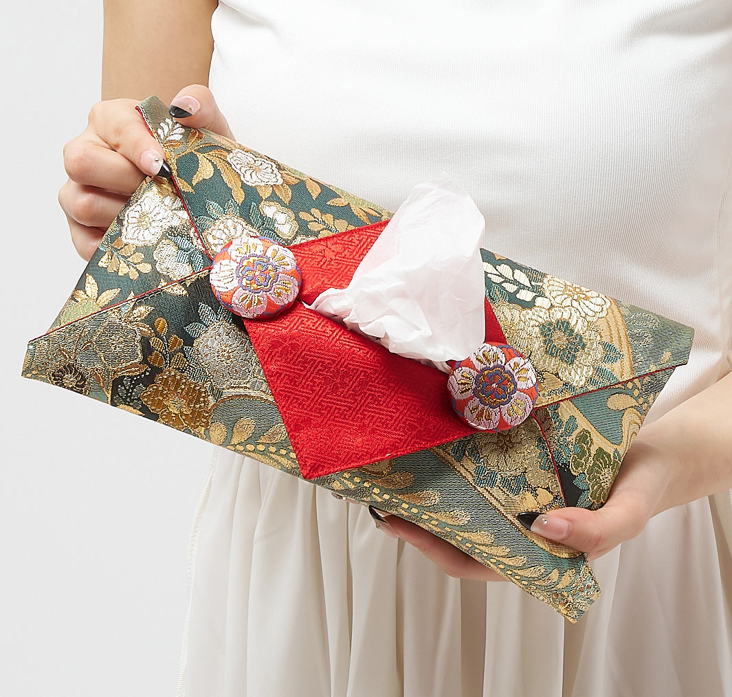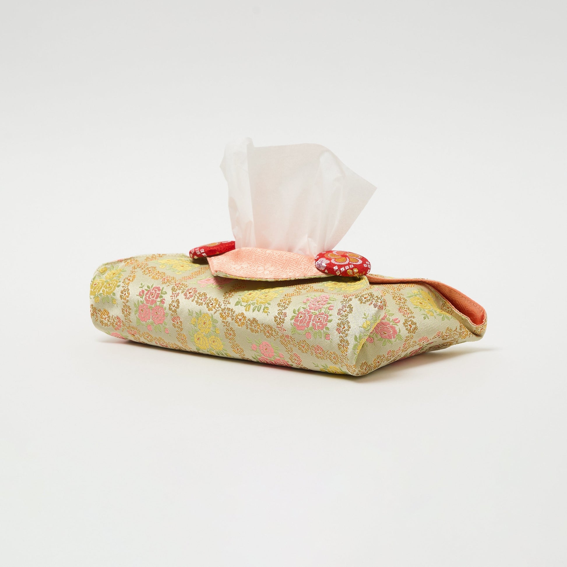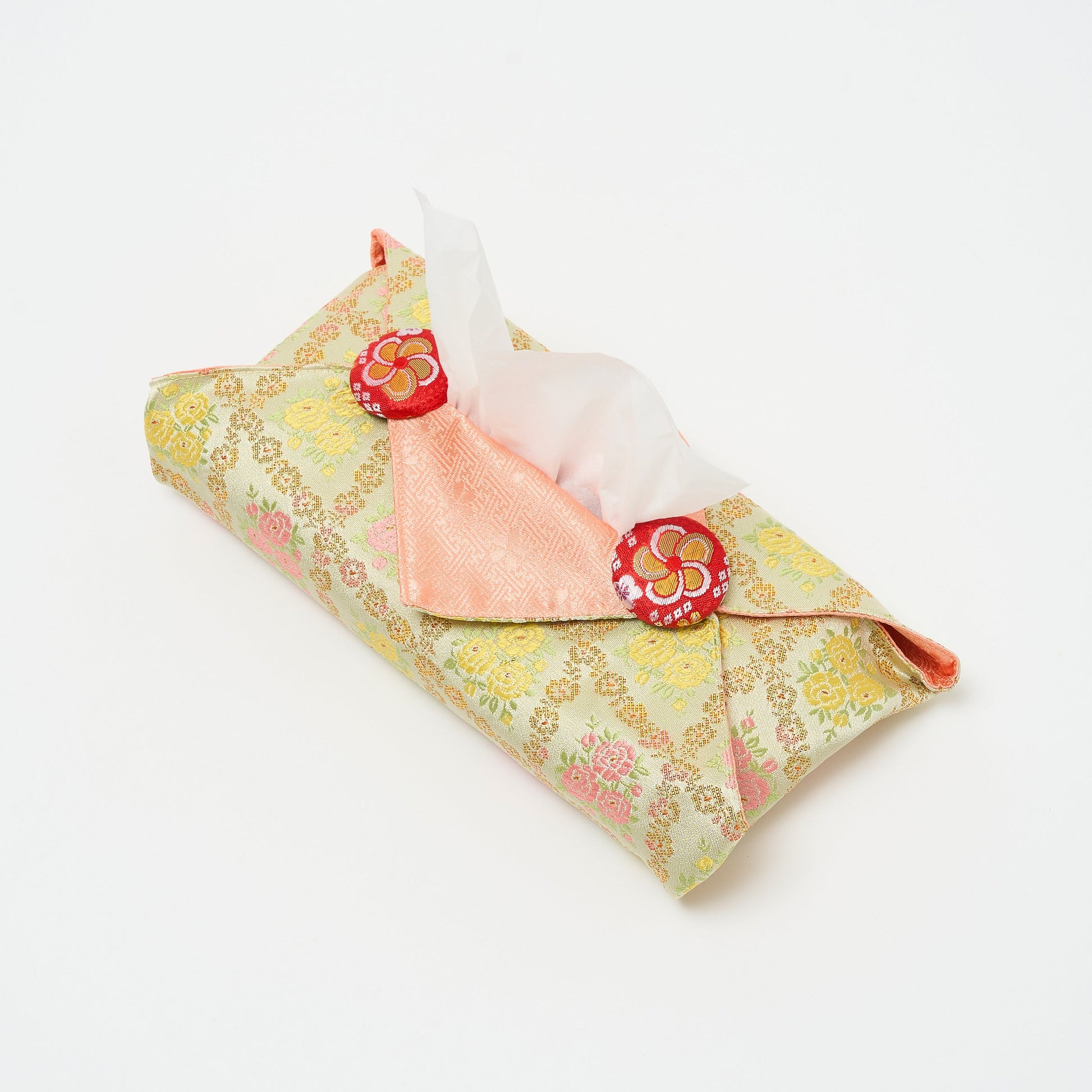 金襴のティッシュカバーは、ちょっと生活感が出やすい箱ティッシュをそっと優しく包んでくれます。 デスクや玄関に置いてあり、伝統の金襴生地の布が日常空間を良く彩ってくれます。
