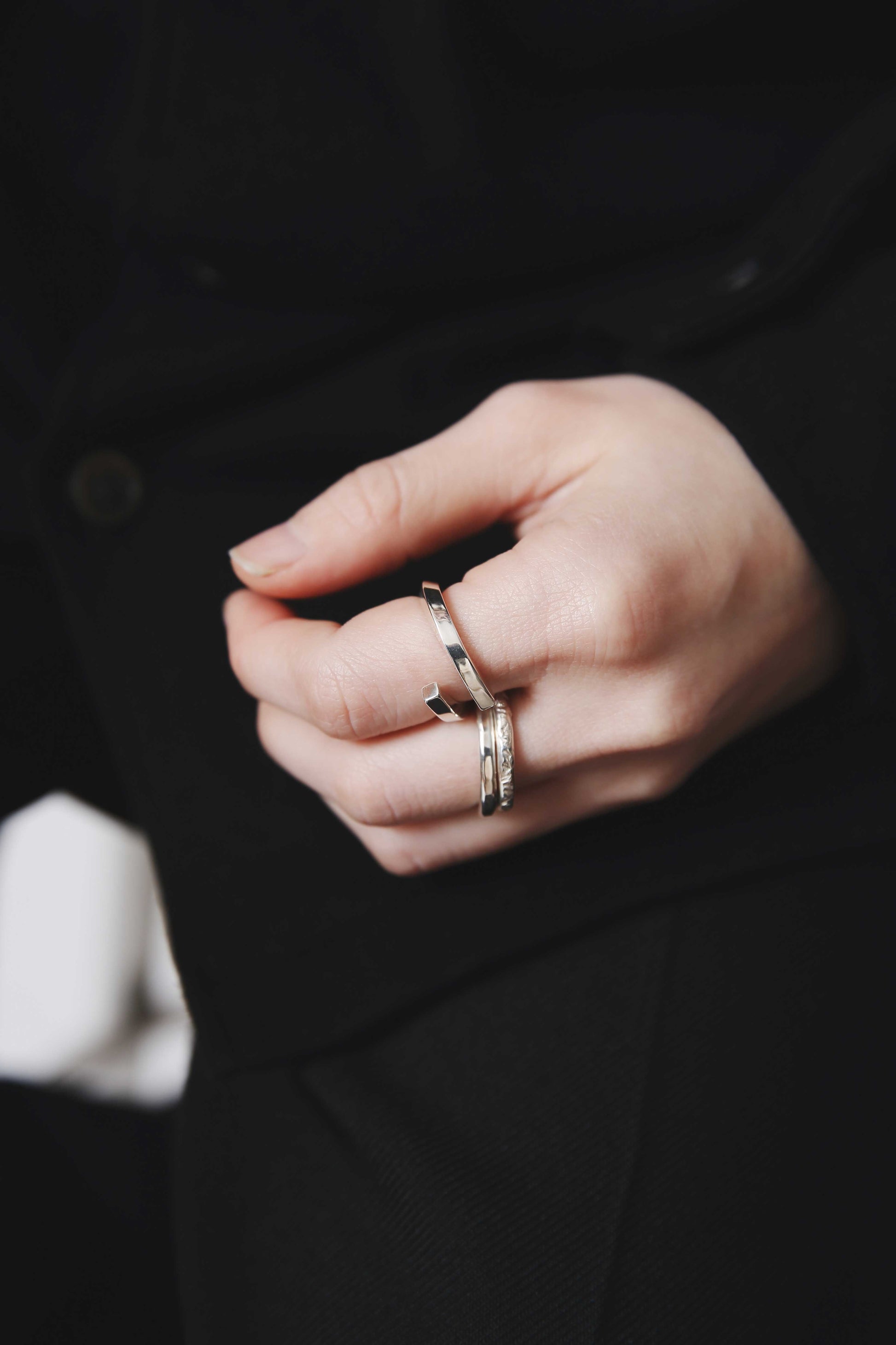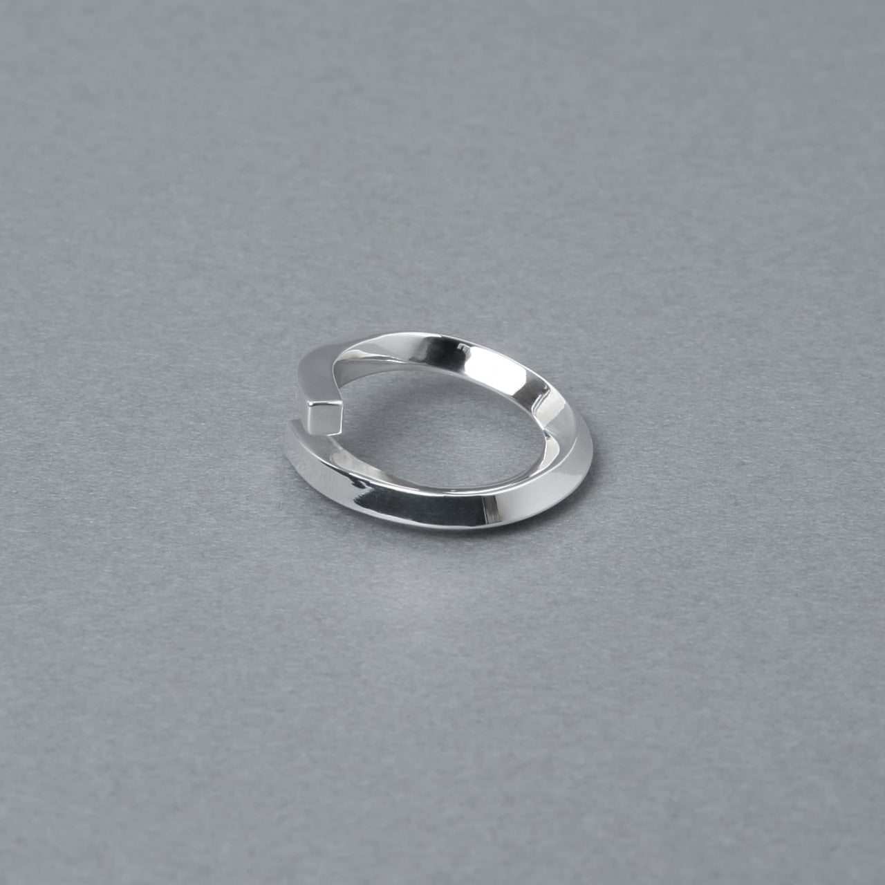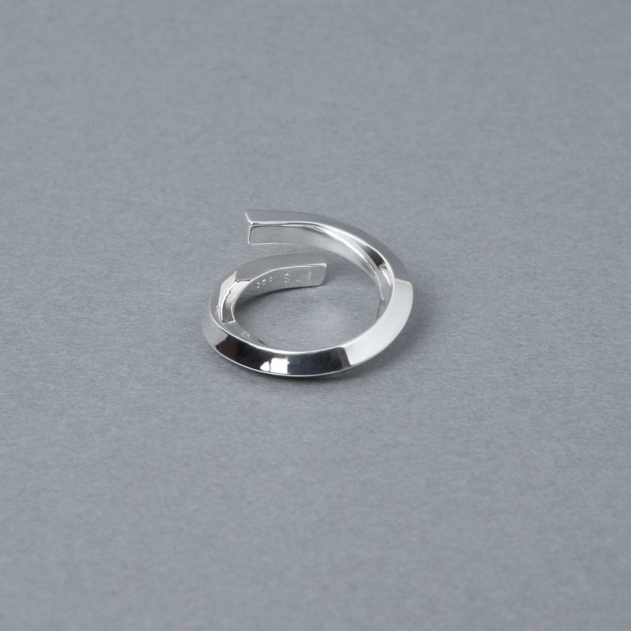 リング自体のボリュームはそこまでないですが、ねじりを加えあらゆる方向へ面が向くことにより、 多方向の光を反射し手元でぴかぴかと輝くので、存在感を放ちます。