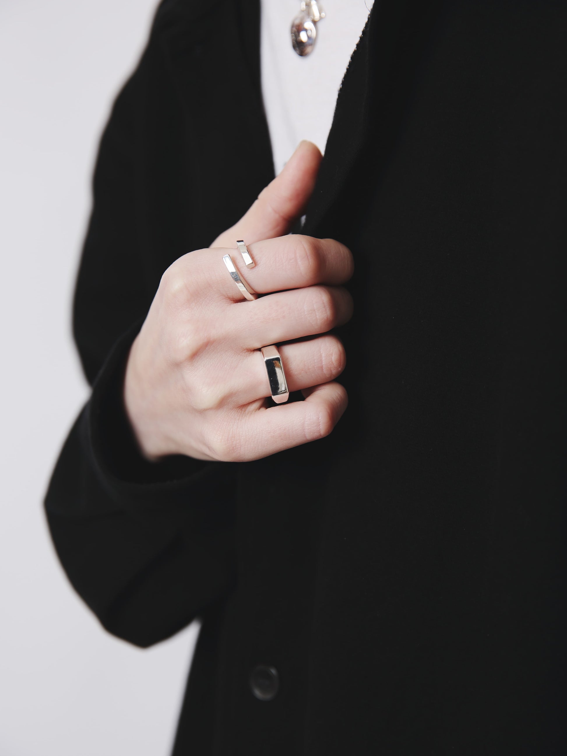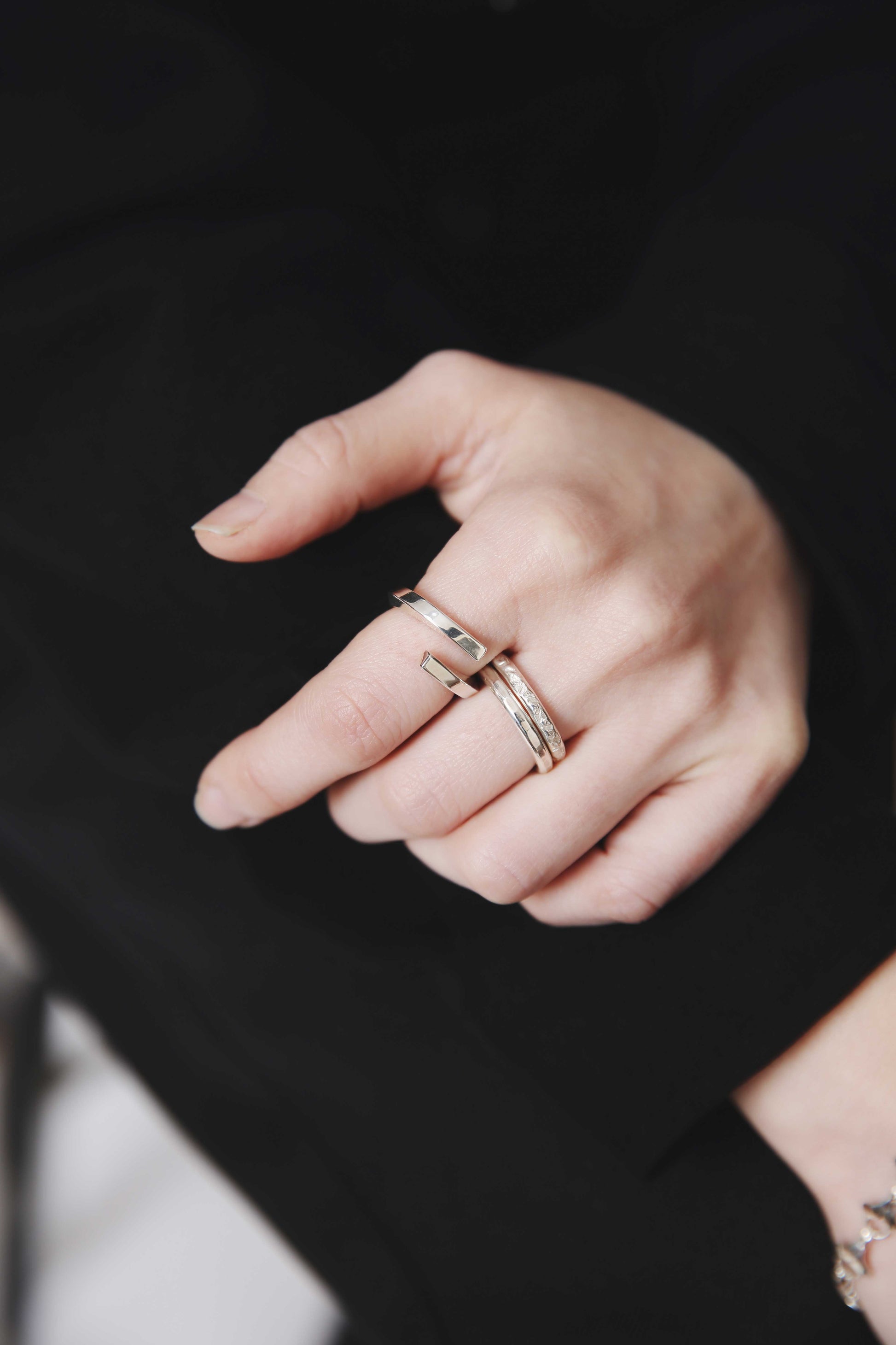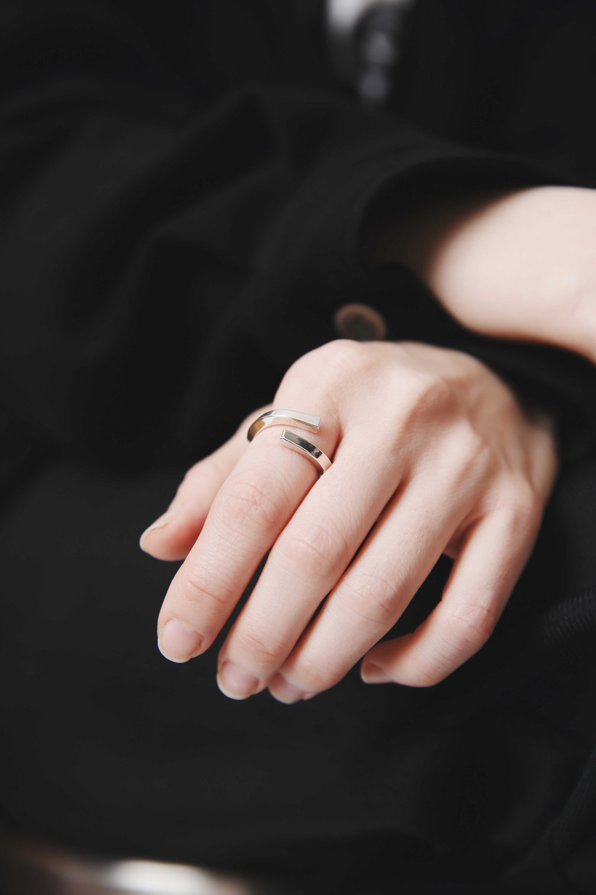 リング自体のボリュームはそこまでないですが、ねじりを加えあらゆる方向へ面が向くことにより、 多方向の光を反射し手元でぴかぴかと輝くので、存在感を放ちます。