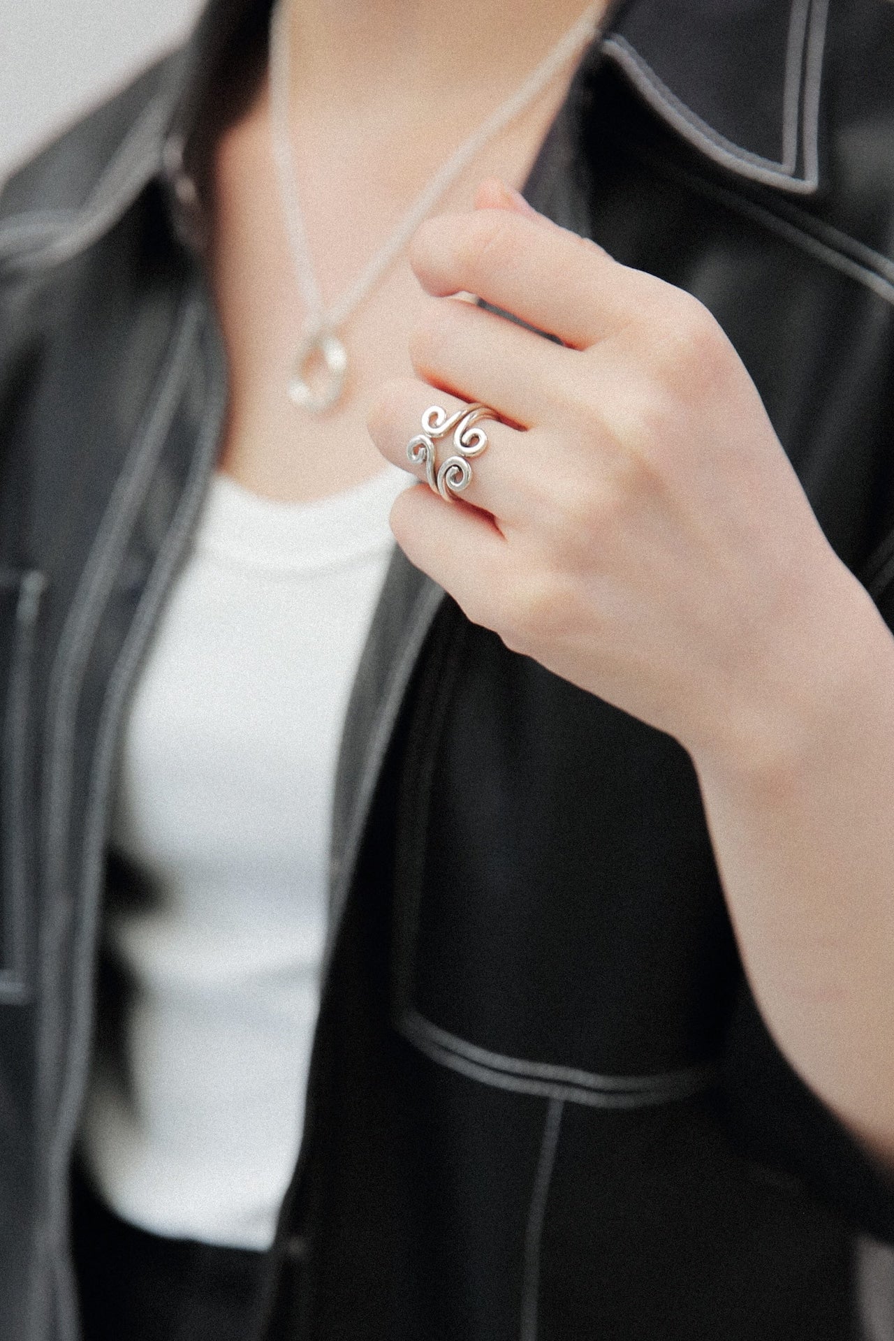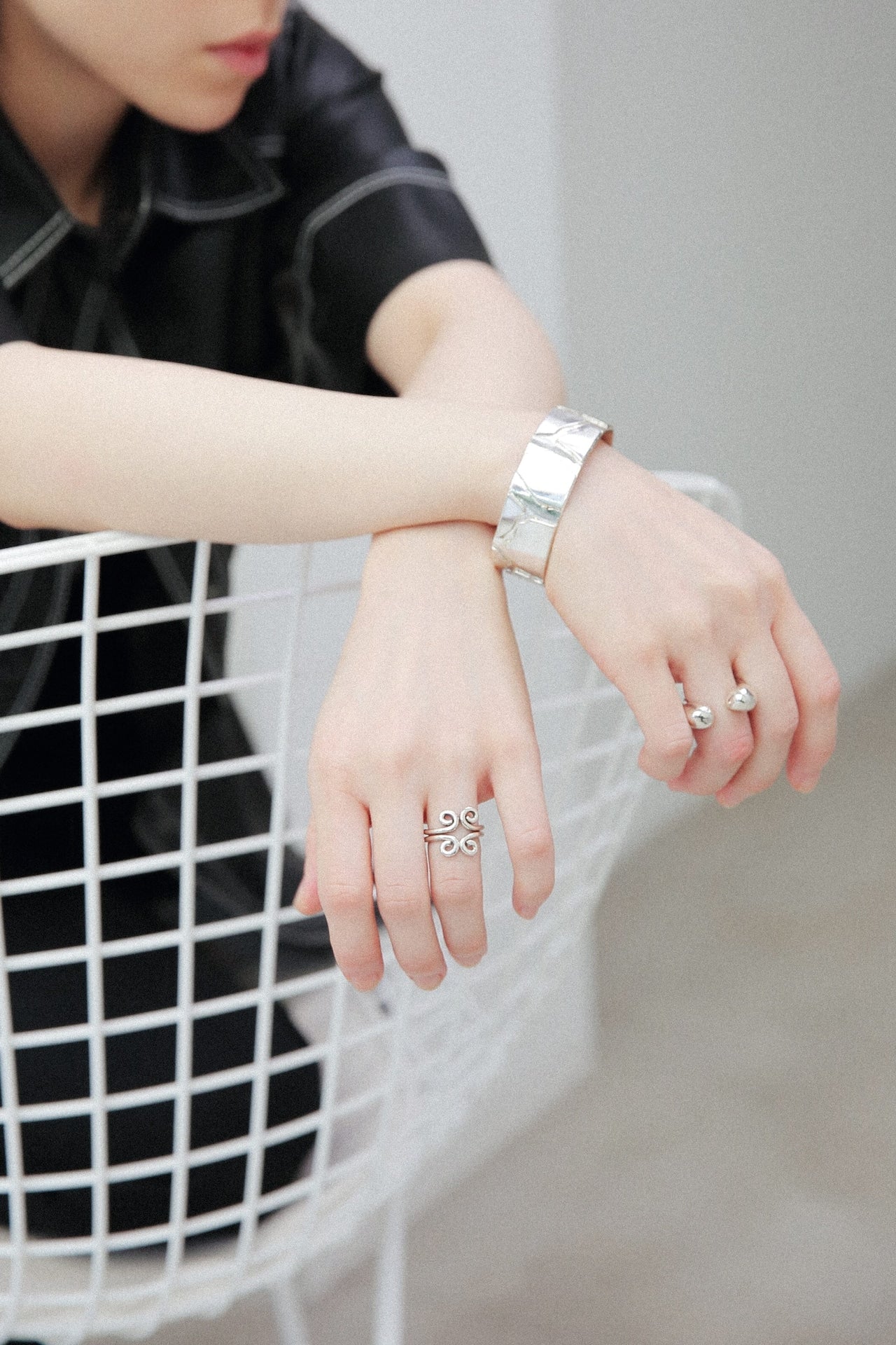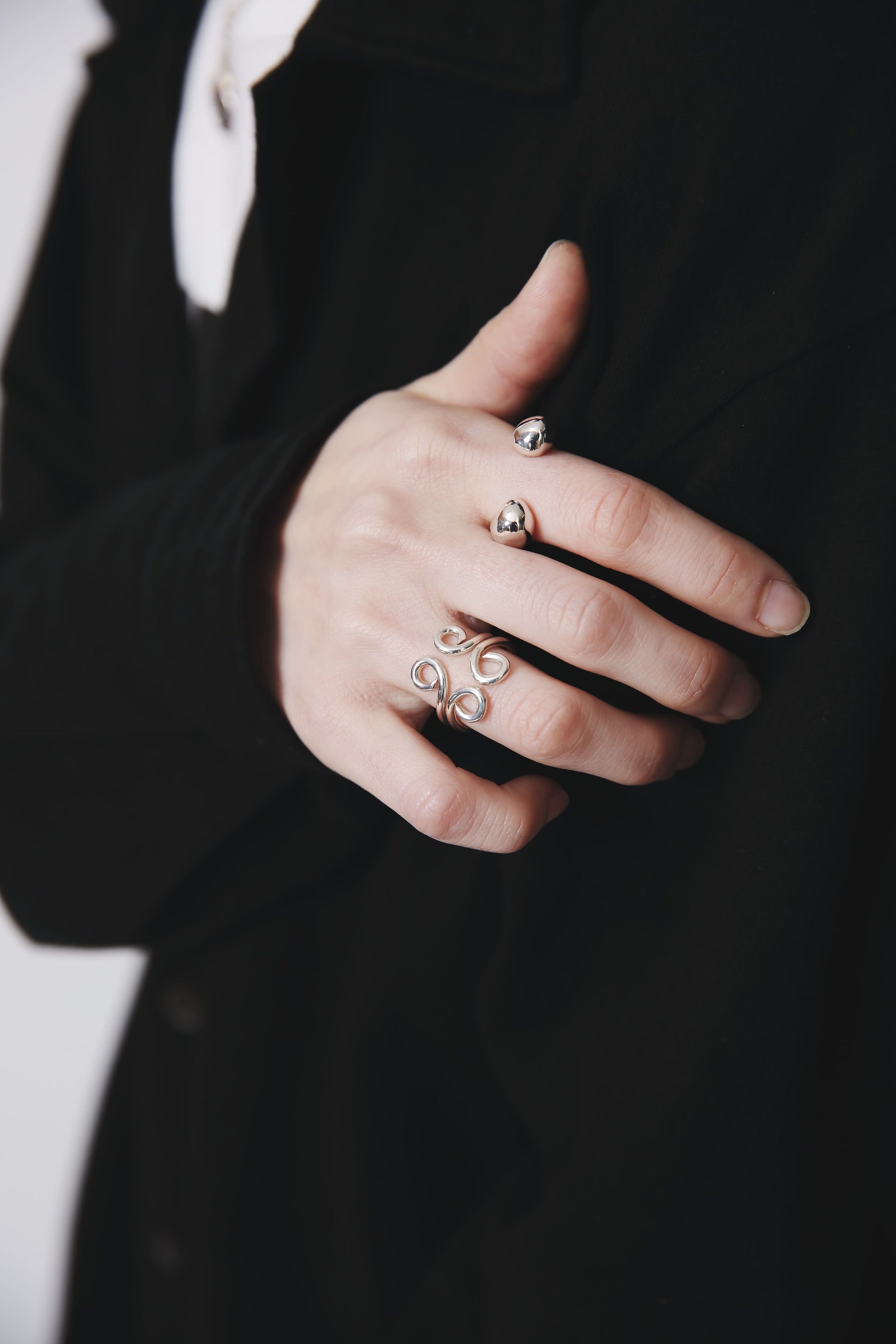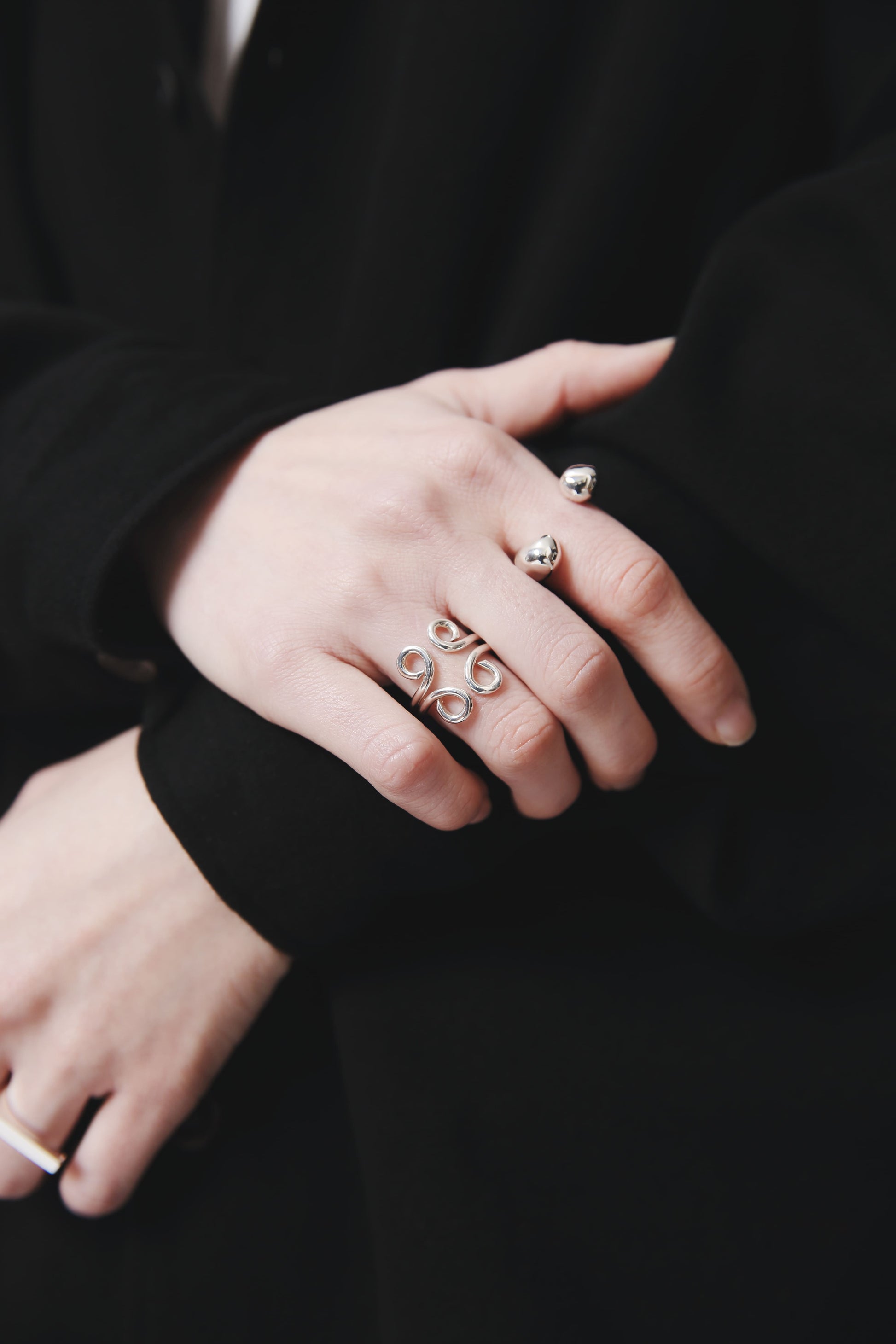 1本だとお花のつるを指に巻き付けたようなデザイン、2本重ねると不思議な模様へと変化します。