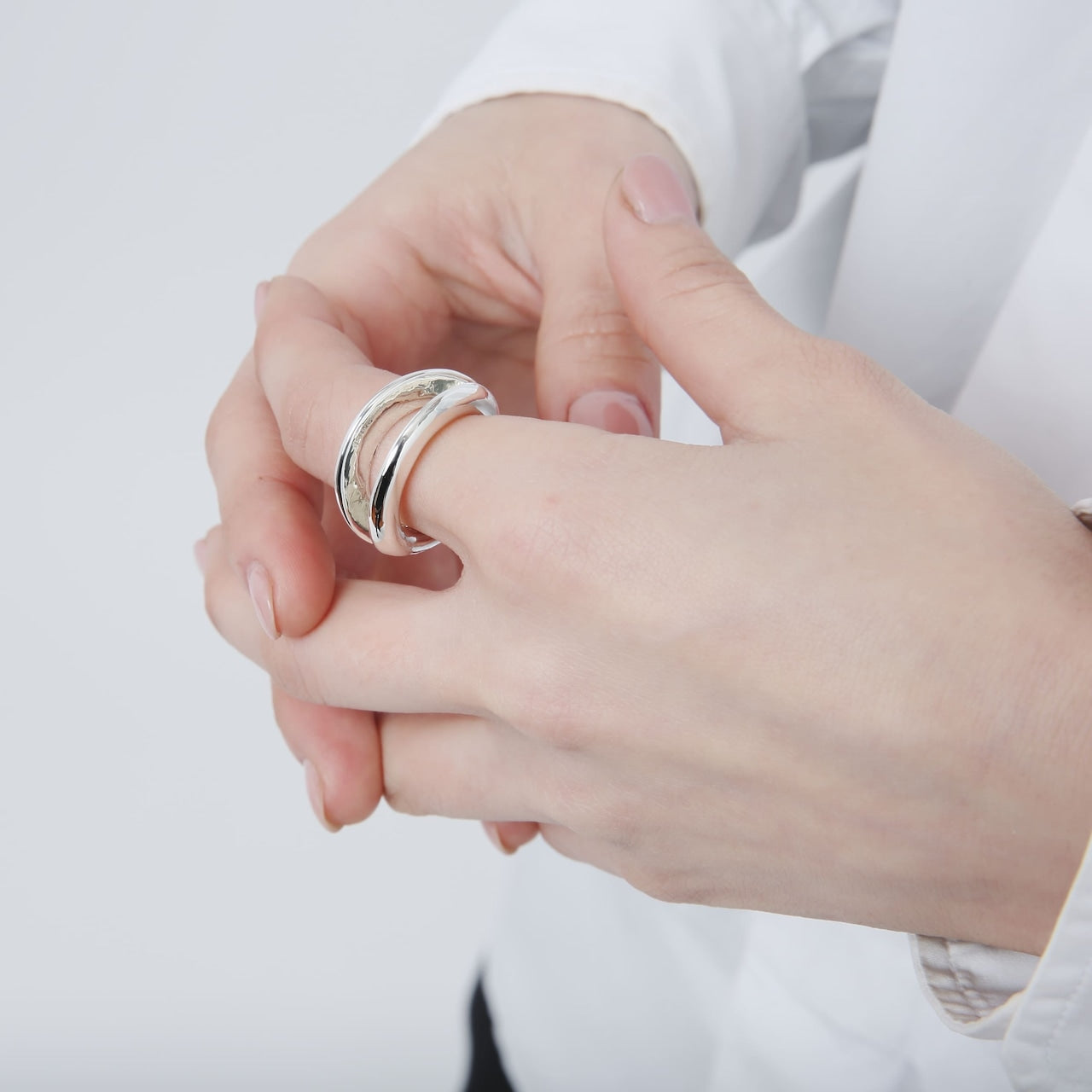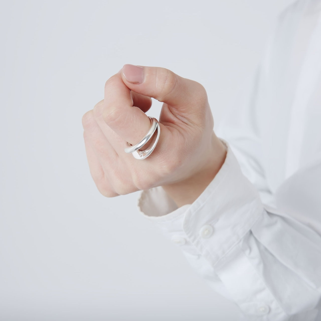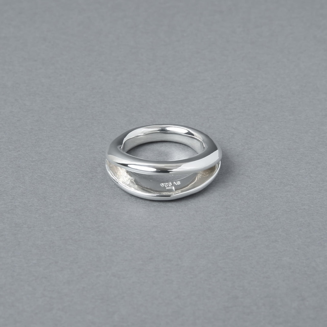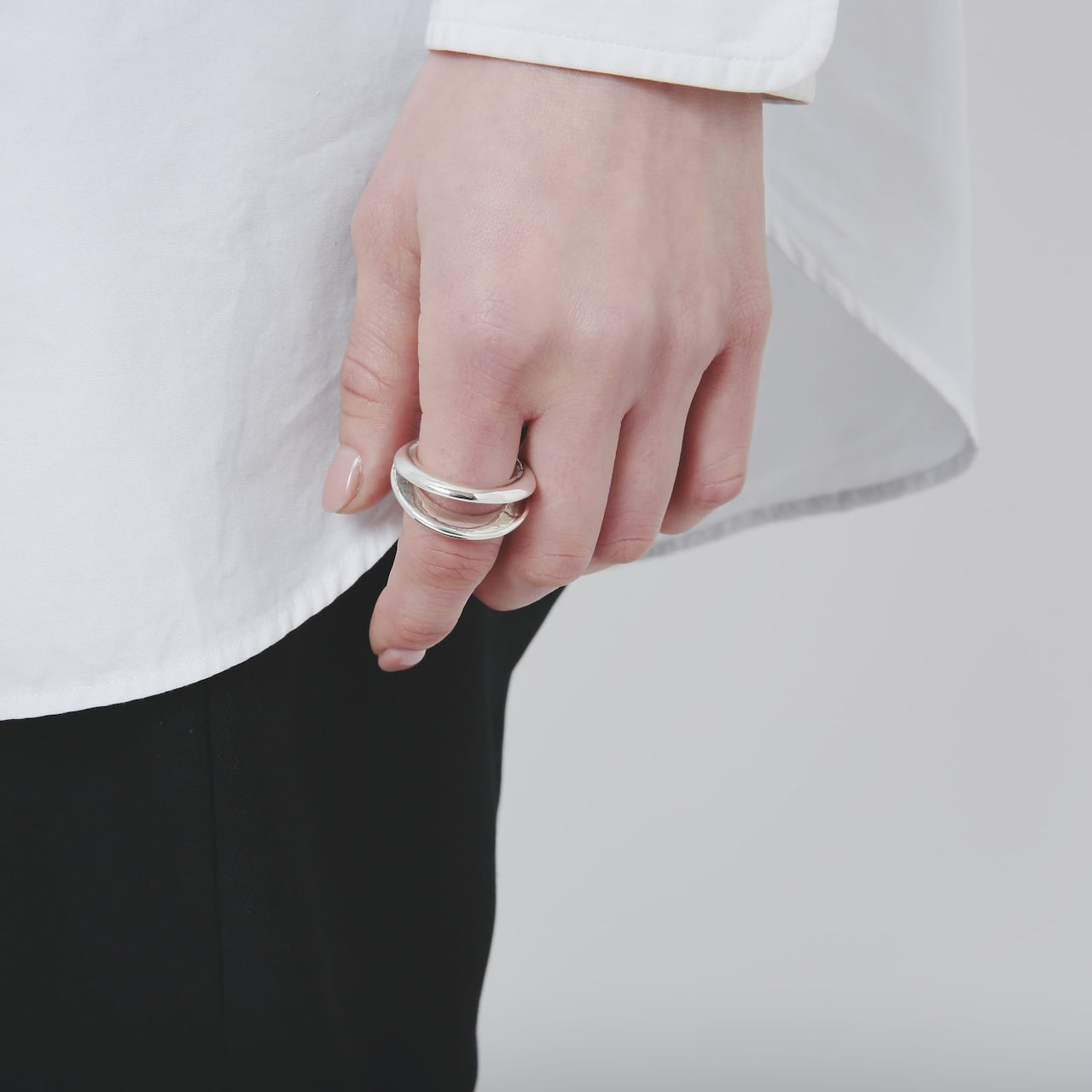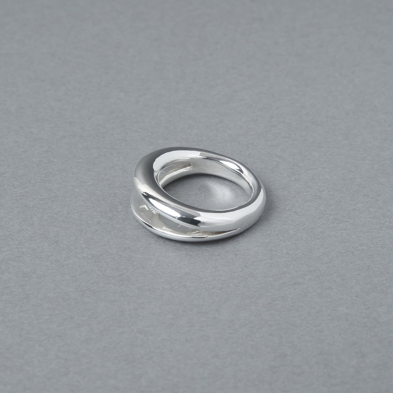 2つに割れたリングトップ部分に少し大げさに立体感を出すことで、このリング一つでも手元のスタイリングが完成するバランスになります。