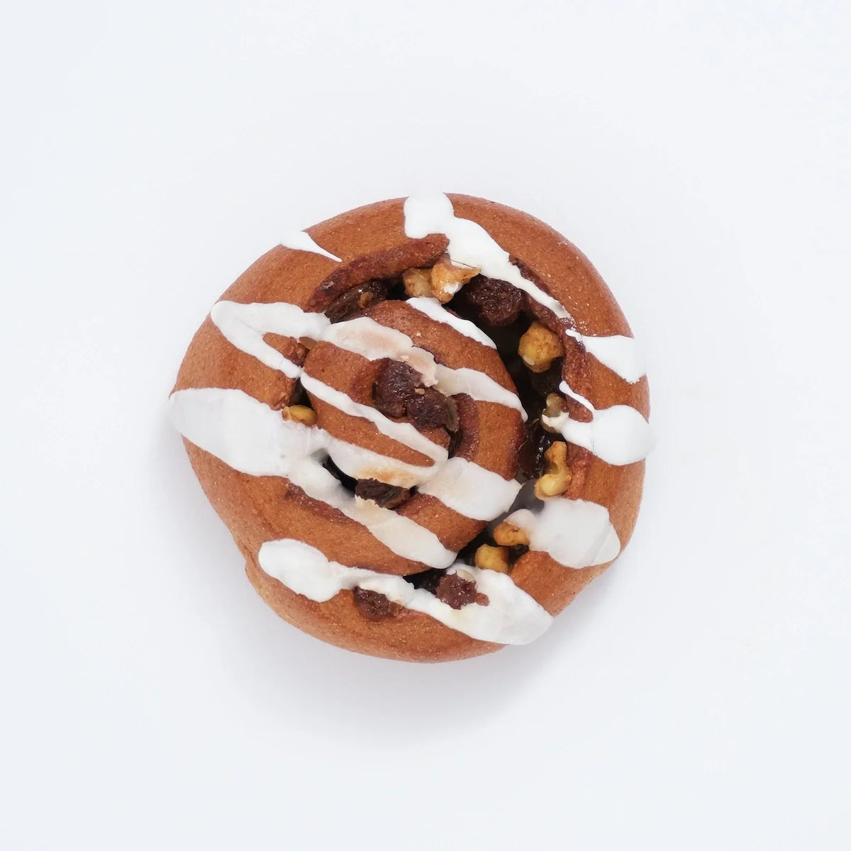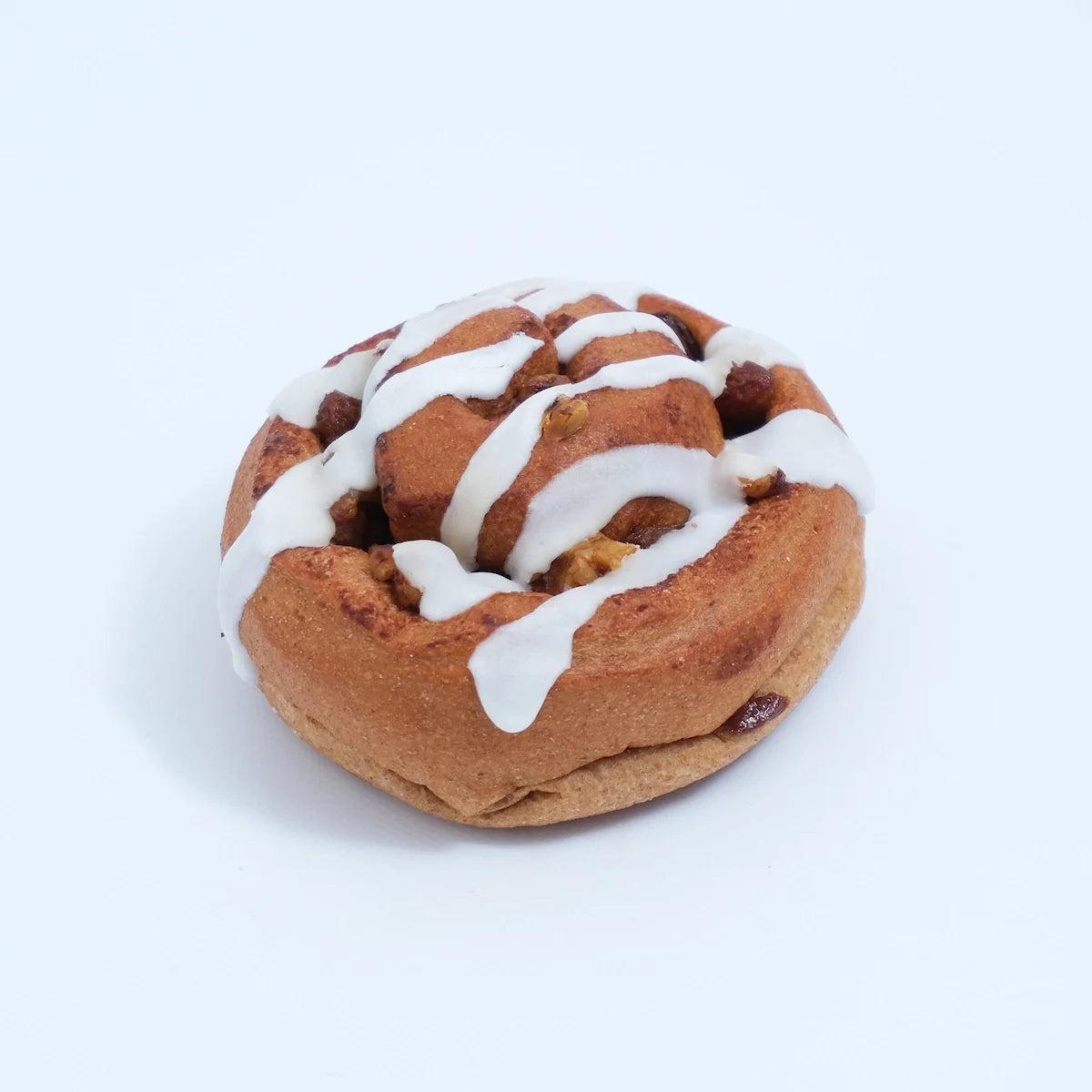 シナモンの香り豊かな生地で有機レーズンとくるみを巻きました。