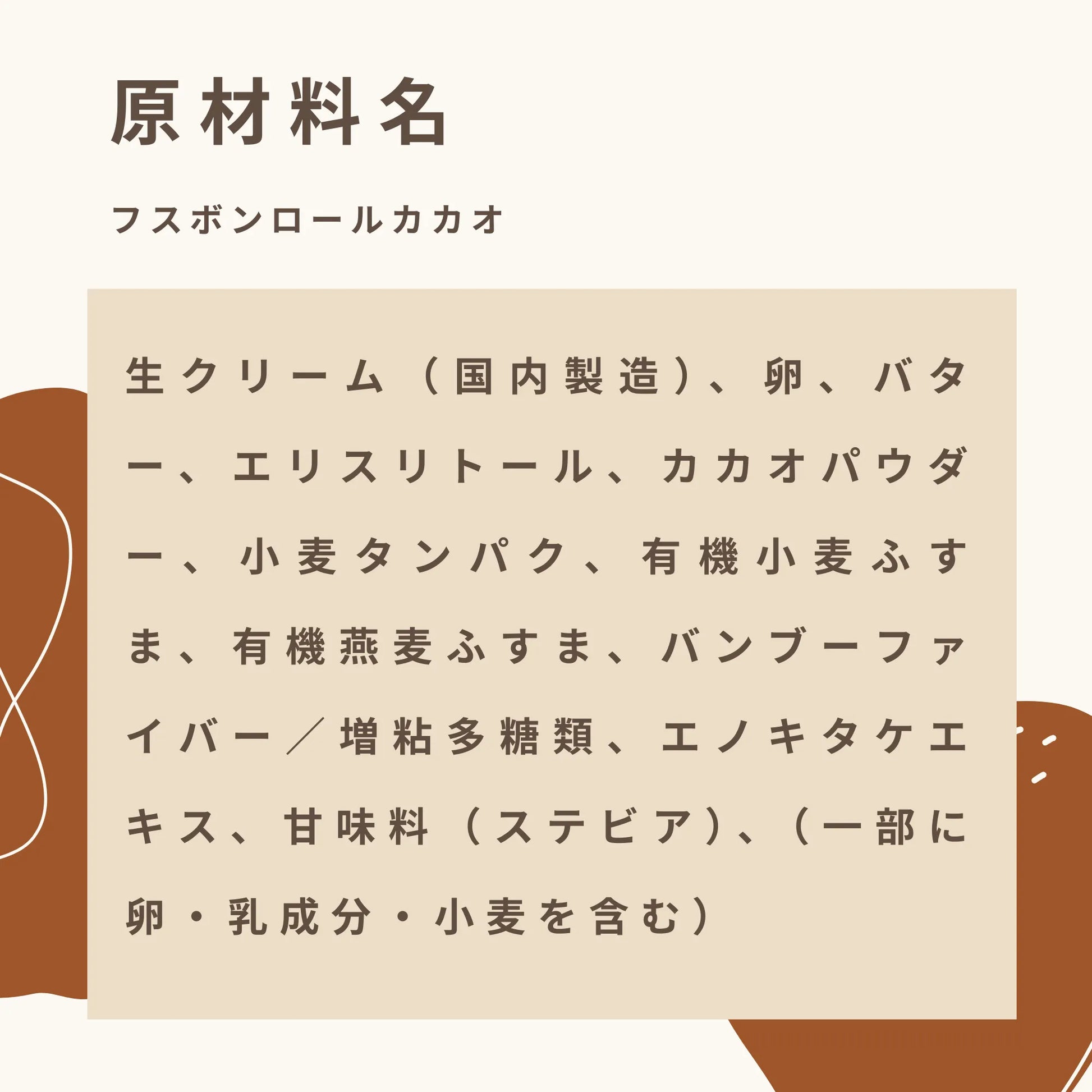 フスボンロールカカオは、豊かなカカオの香りと味わいを楽しめる糖質2.4gの低糖質ロールケーキです。