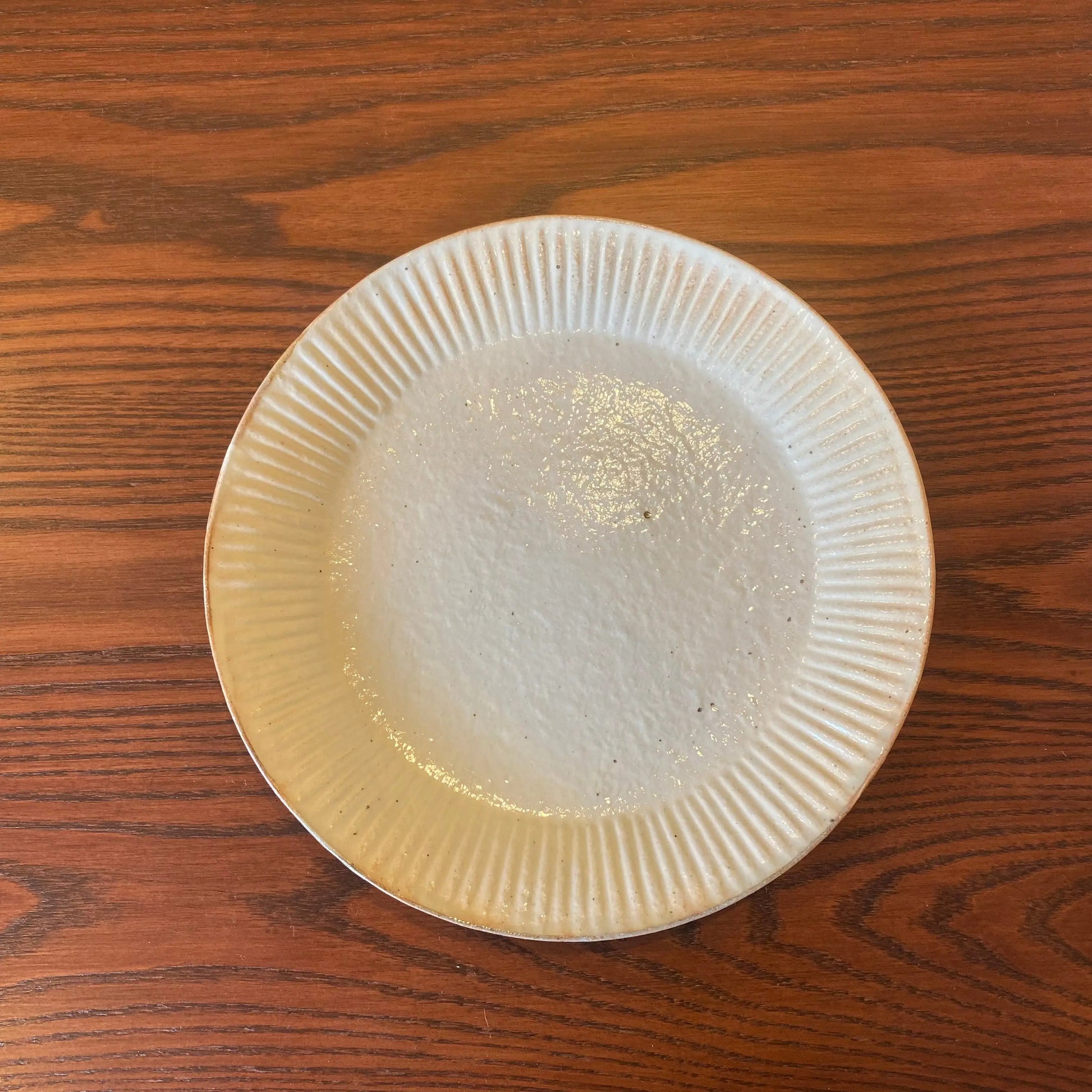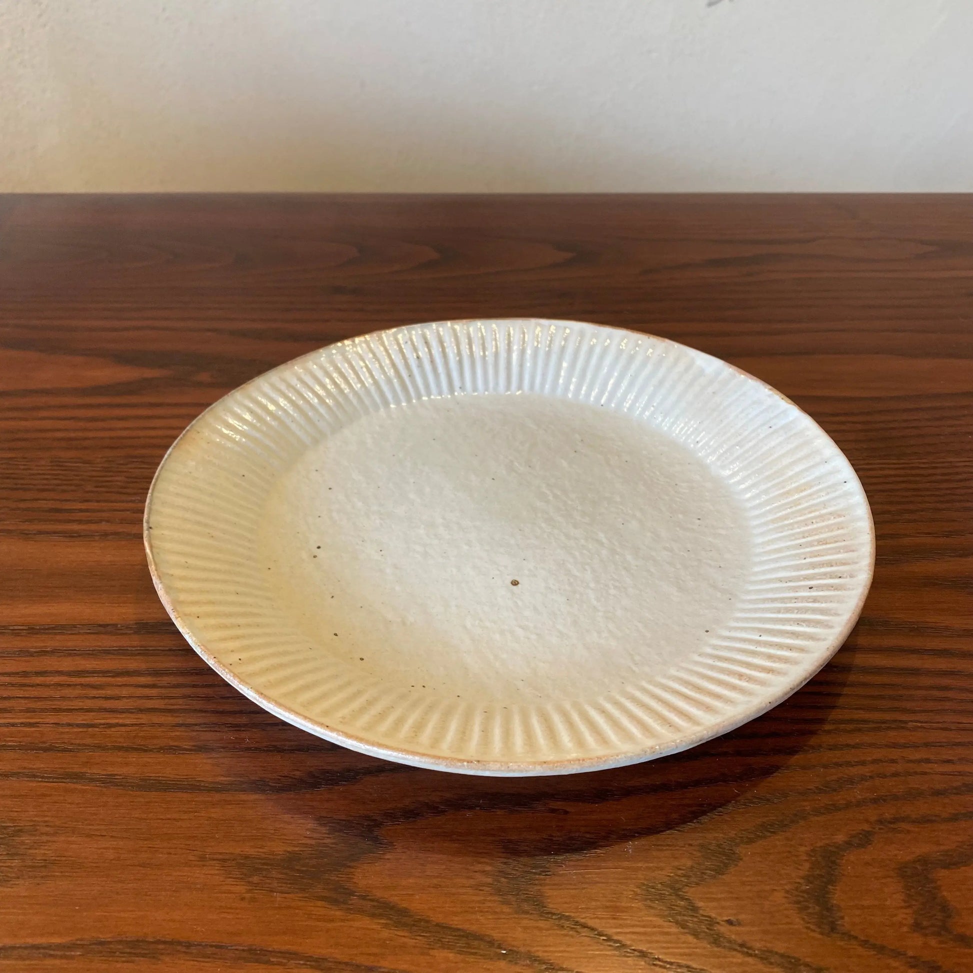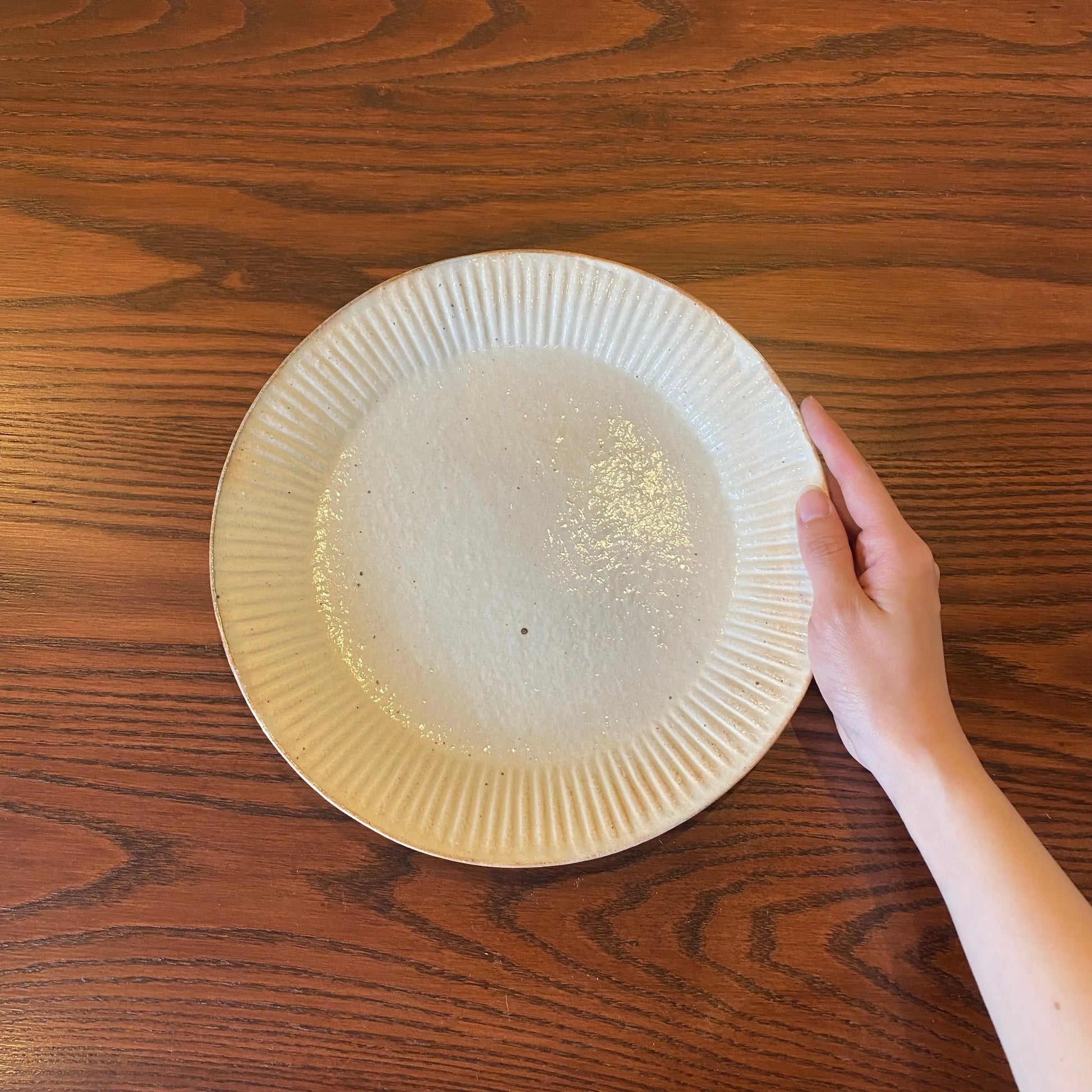 古谷製陶所の「ラッフルプレート L 鉄散」は、リム部分にひだ飾り(ラッフル)を施した温かみのある粉引のプレートです。