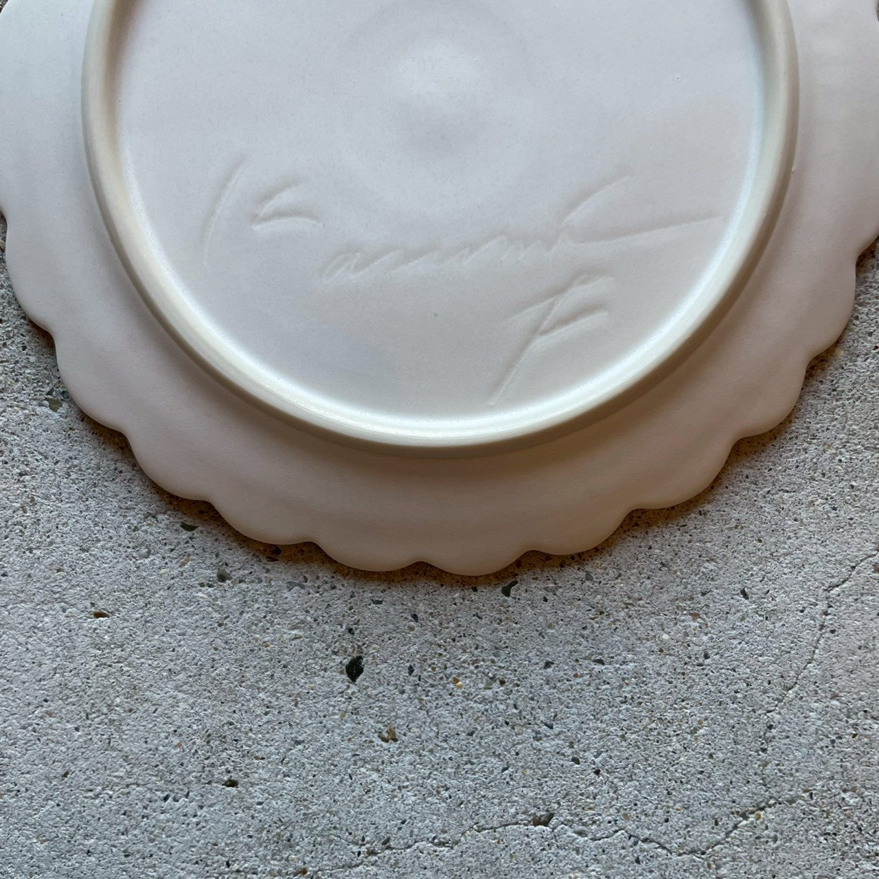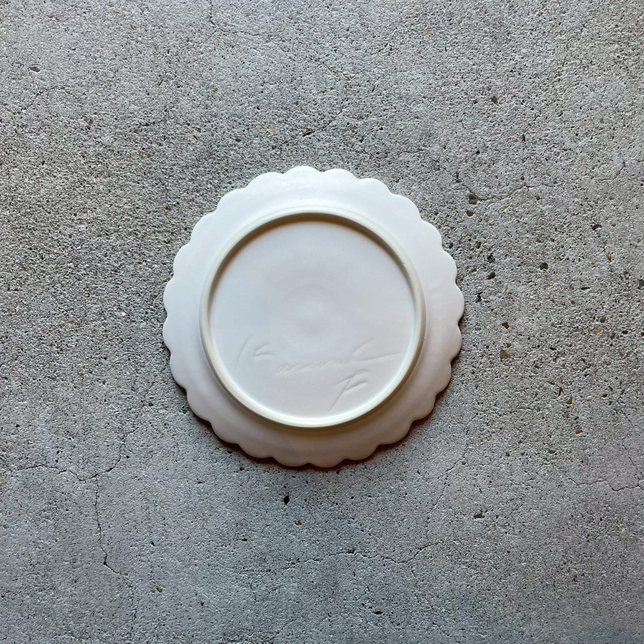 藤村佳澄さんの「五寸皿 五寸手彫り皿 白」は、直径約15cmの程よい大きさに、手仕事ならではの彫り模様が刻まれた白磁の器です。ひとつひとつ丁寧に彫られた線が光を受けて陰影をつくり、シンプルな白に豊かな表情を与えています。