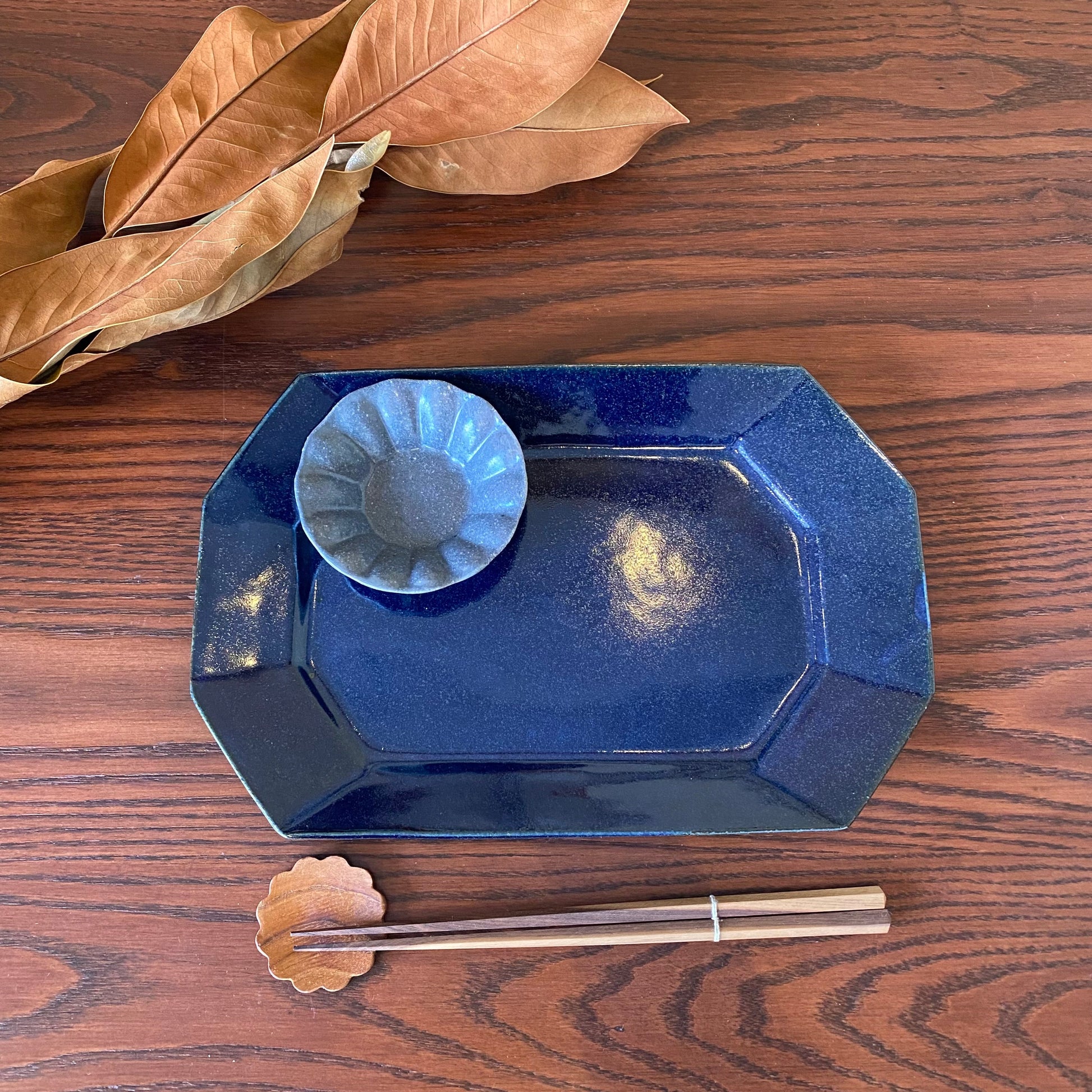 深海を思わせる美しい瑠璃色が施された、八角の大皿