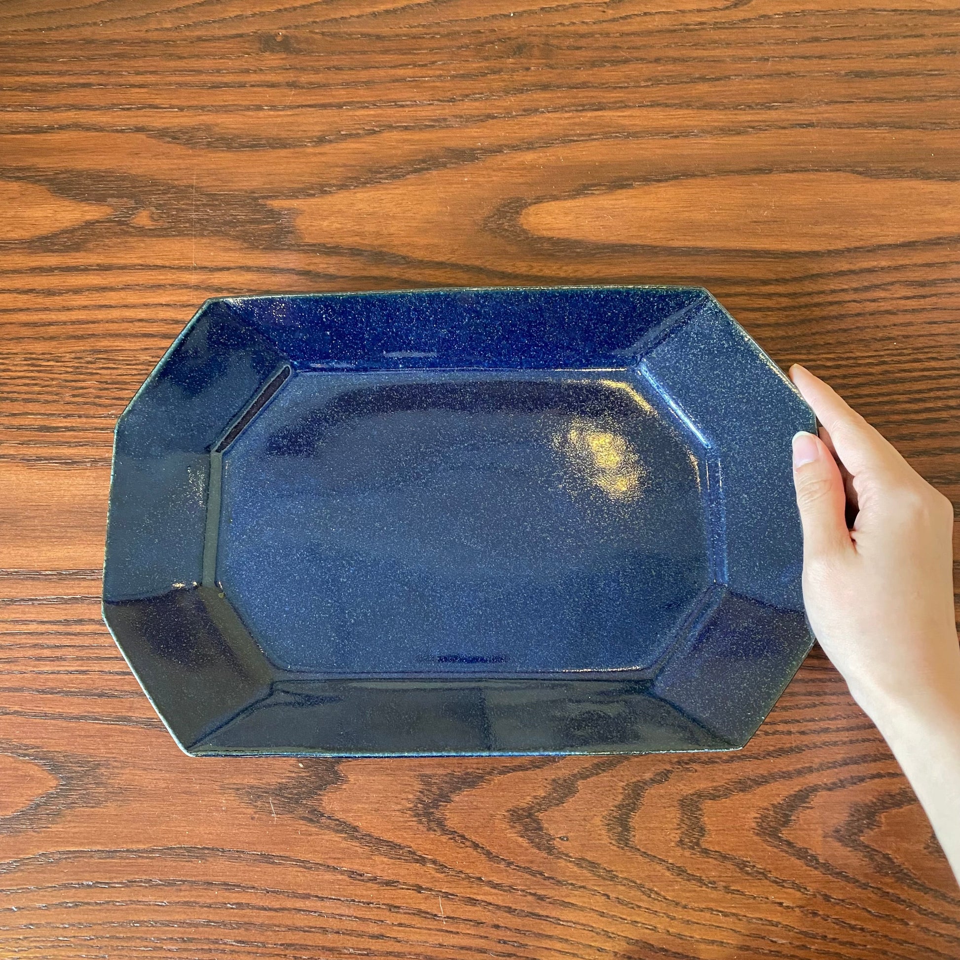 古谷製陶所の「八角プレート 大 瑠璃釉」は、深海を思わせる美しい瑠璃色の釉薬が施された八角形の大皿です。