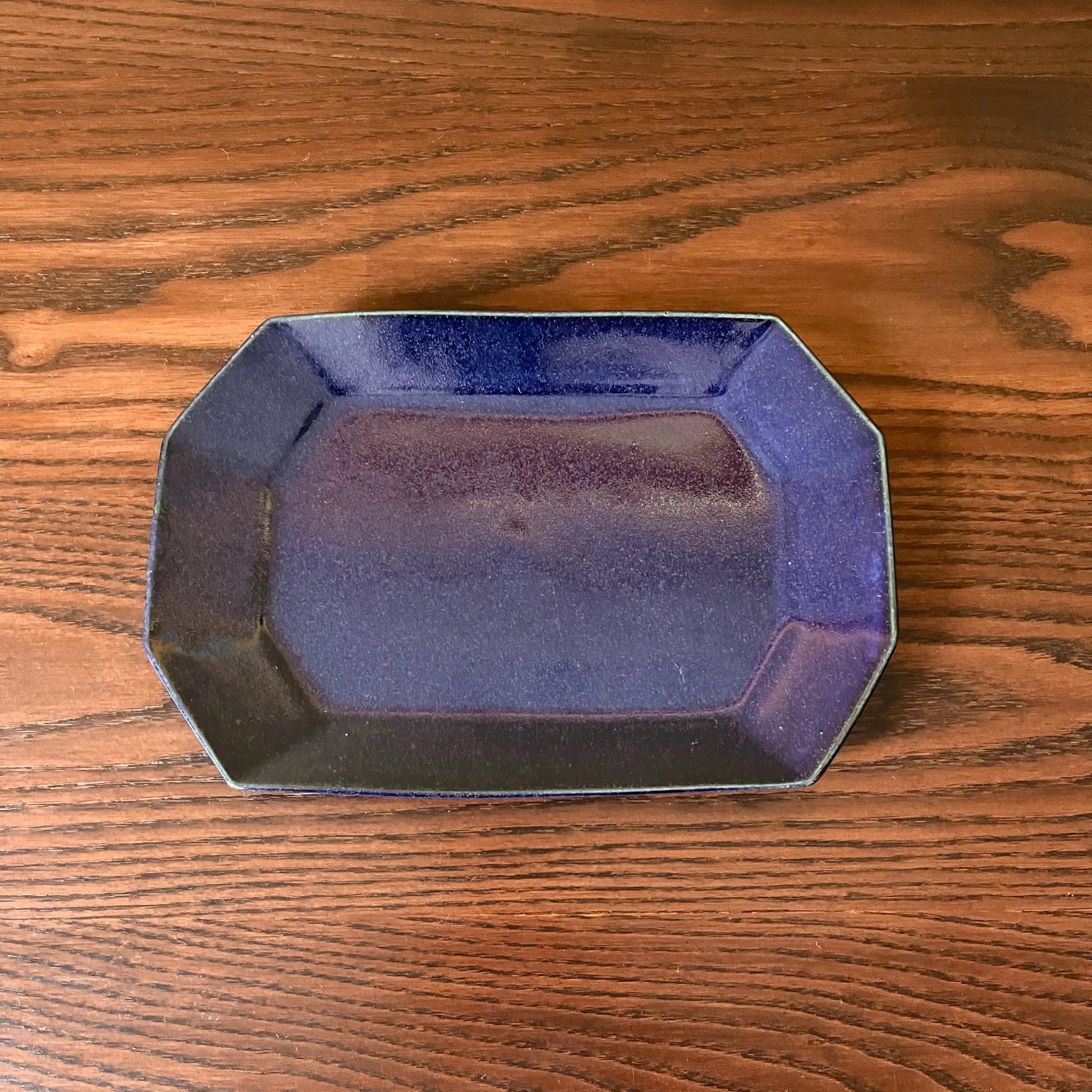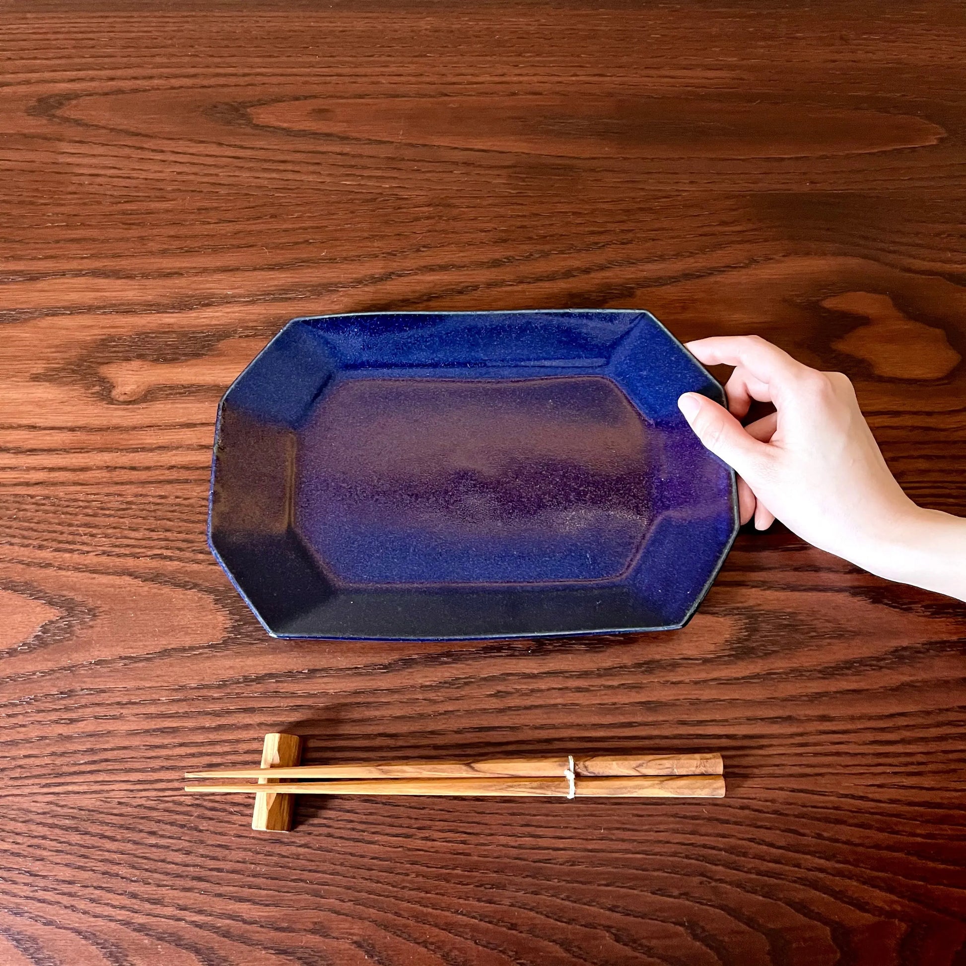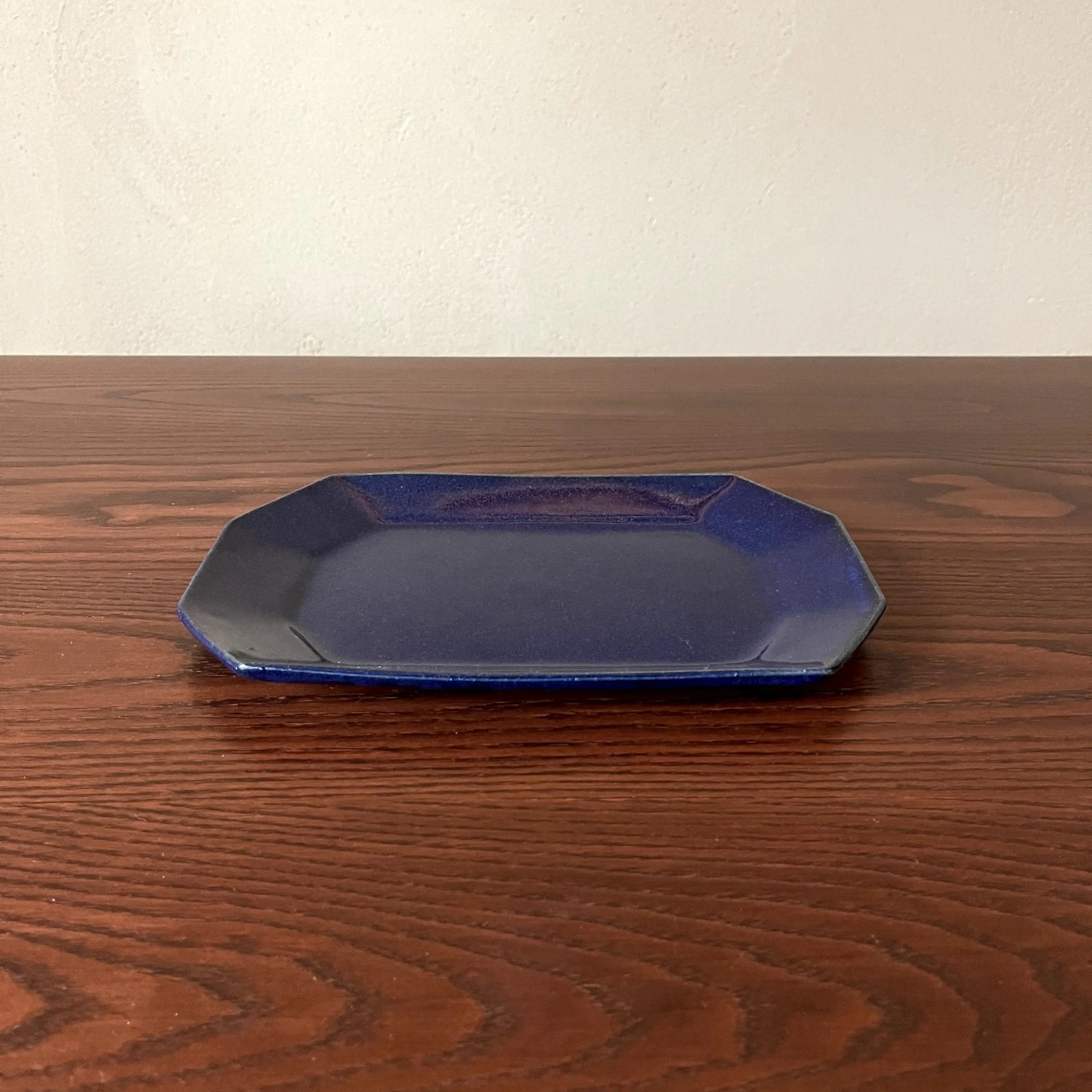 古谷製陶所の「八角プレート 小 瑠璃釉」は、深海を思わせる美しい瑠璃色の釉薬が施された八角形の大皿です。