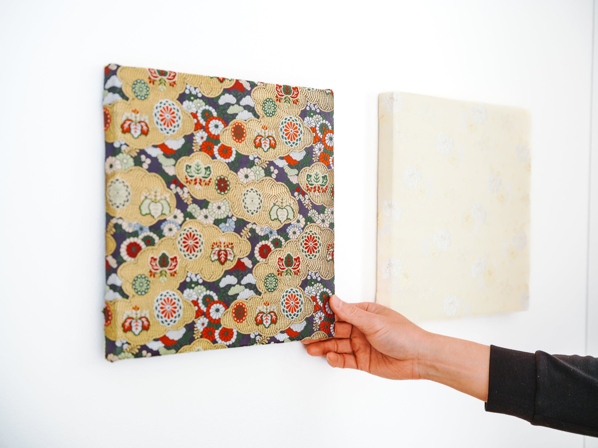 ファブリックボードに:好きな大きさの枠を買ってきて、金襴生地を貼って壁にいるだけで素敵なインテリアの出来上がりです。
