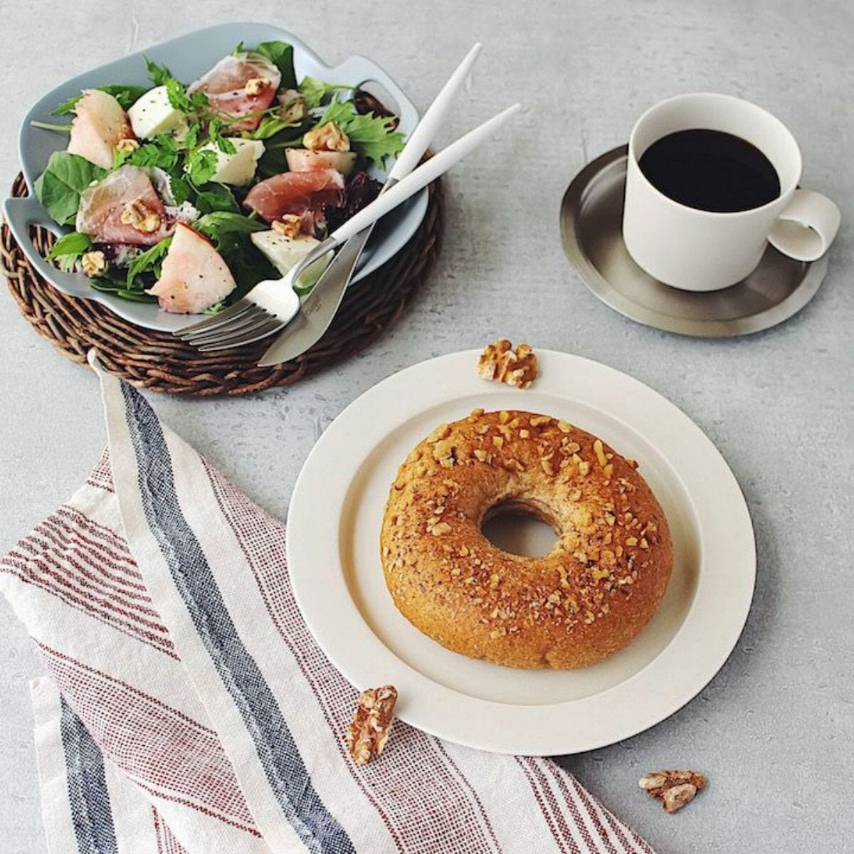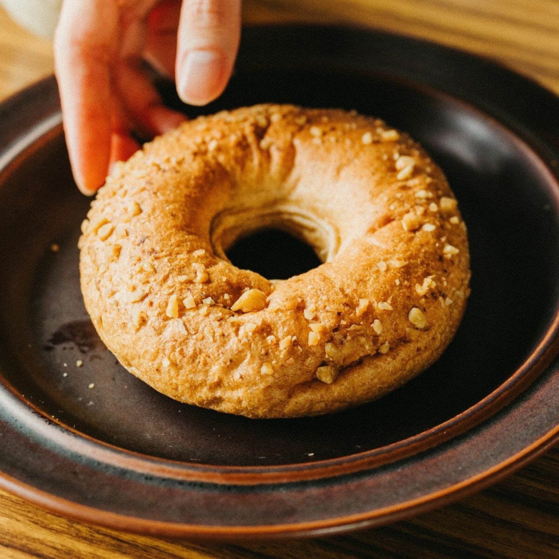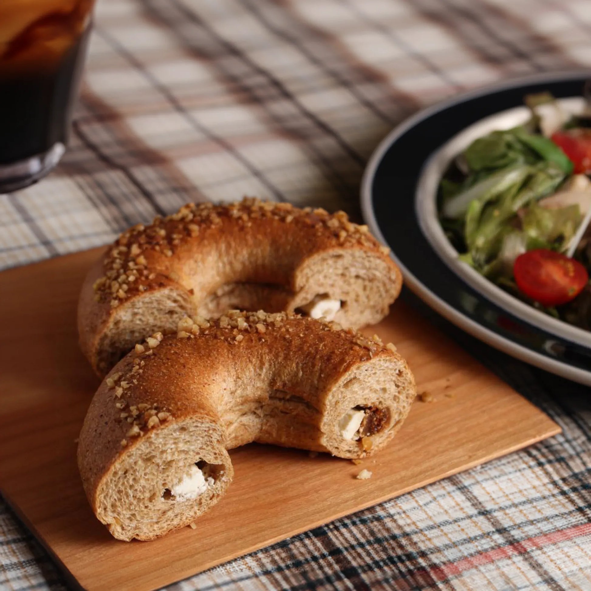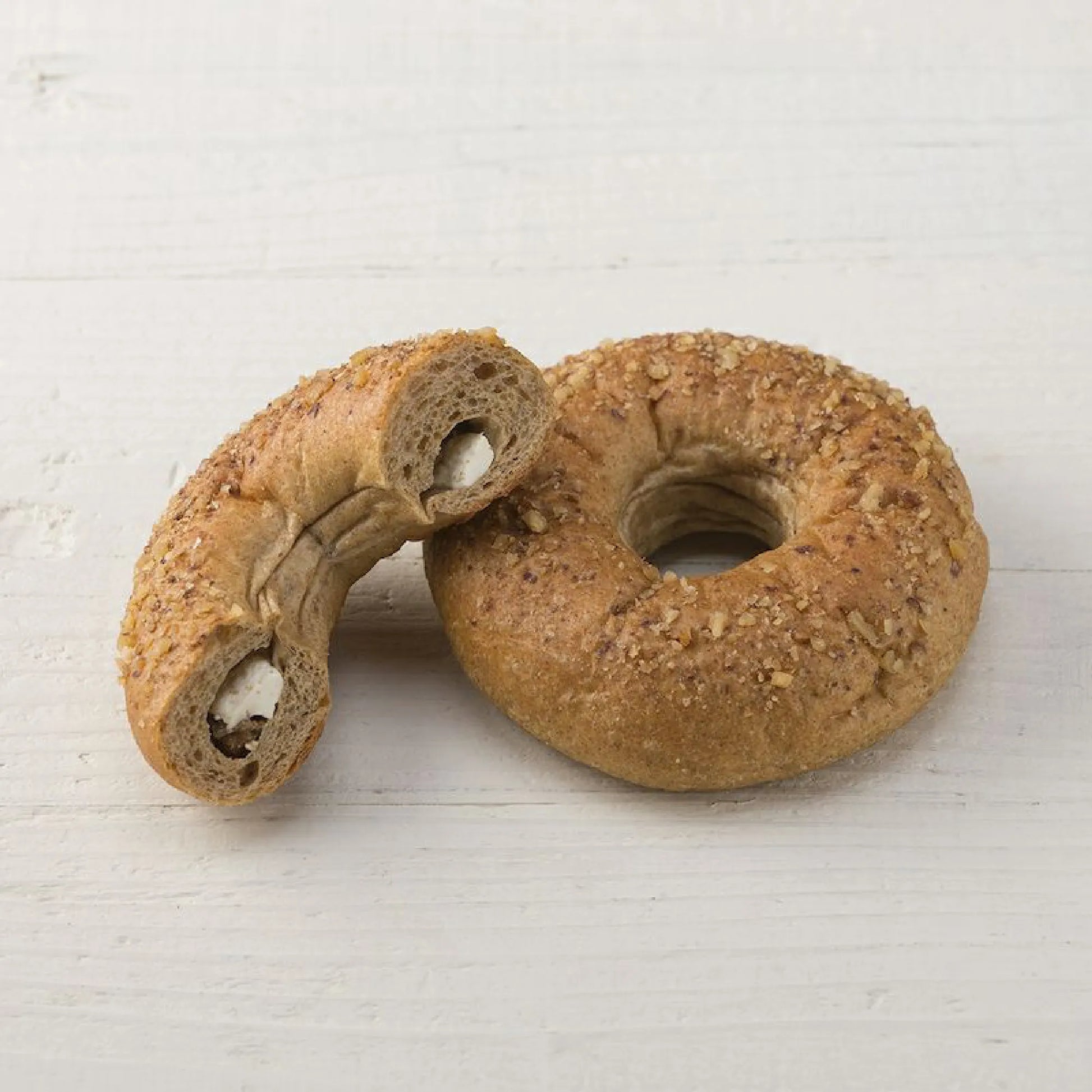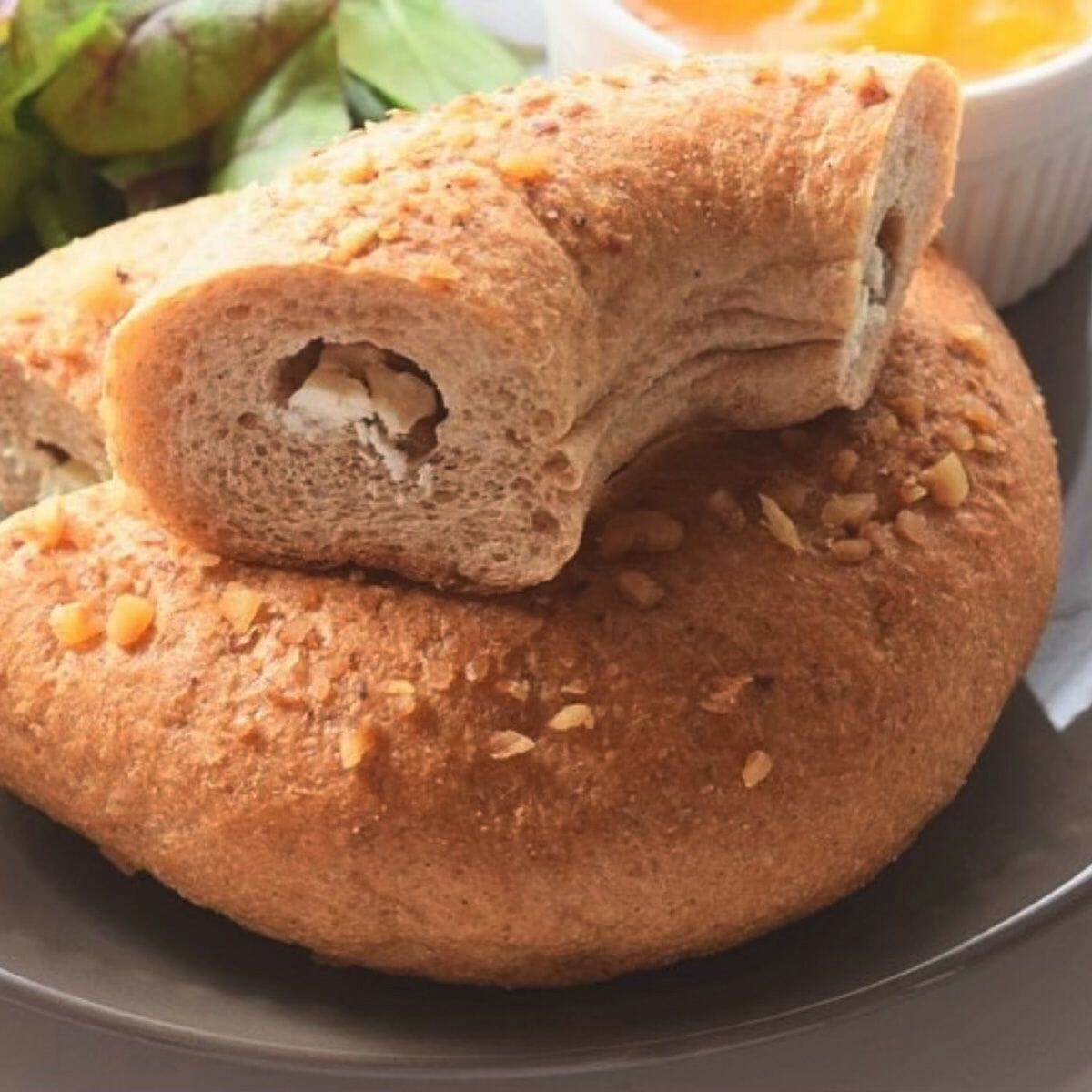 甘く芳醇ないちじくと、滑らかなクリームチーズ、香ばしいくるみが一体となった「いちじくクリームチーズwithくるみベーグル」。低糖質ながら、贅沢な味わいを楽しめるベーグルです。いちじくの自然な甘みがクリームチーズと絶妙にマッチし、くるみの食感がアクセントとして加わり、満足感のある一品です。