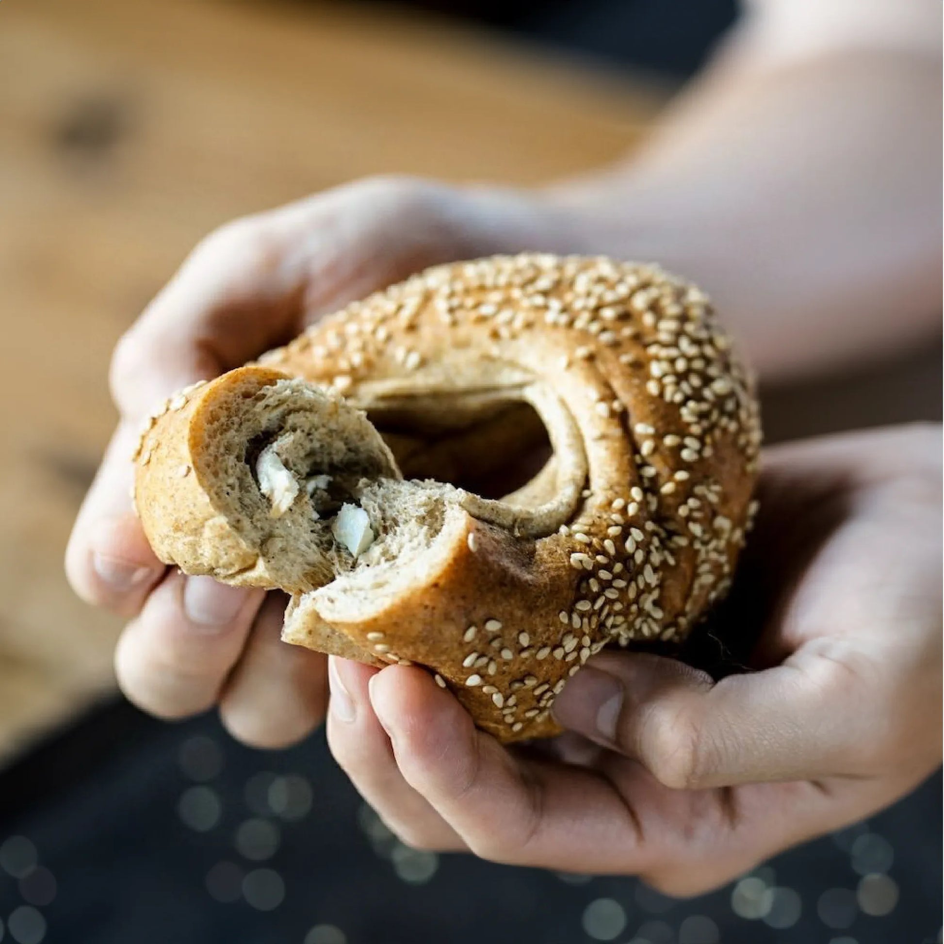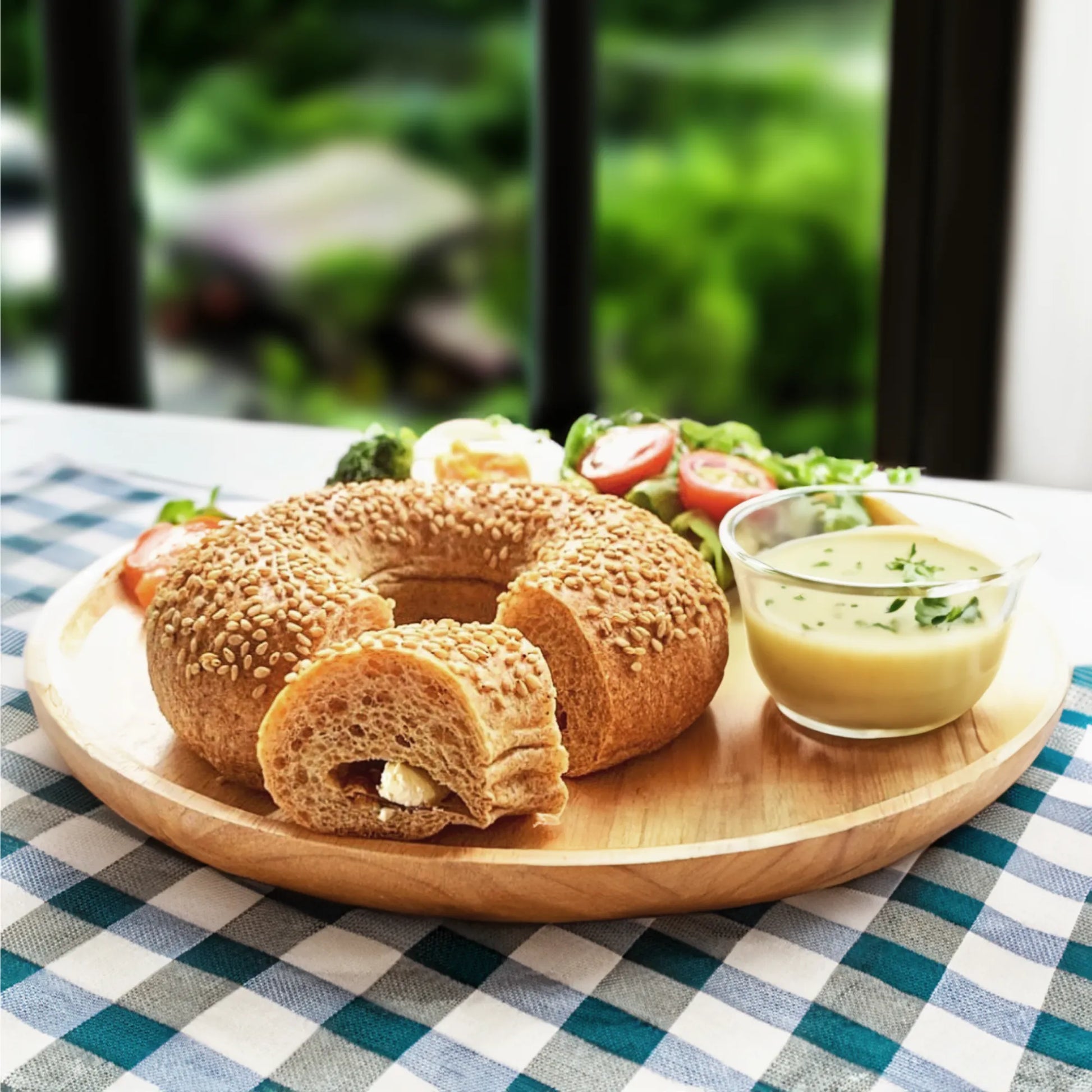 香ばしい素揚げオニオンとクリーミーなクリームチーズがたっぷり入った「オニオンクリームチーズwithセサミベーグル」。白ごまがトッピングされ、ひと口ごとに感じるごまの風味と、オニオンの甘みが絶妙なハーモニーを奏でます。糖質を抑えつつも、豊かな味わいと食感が楽しめる低糖質ベーグルです。