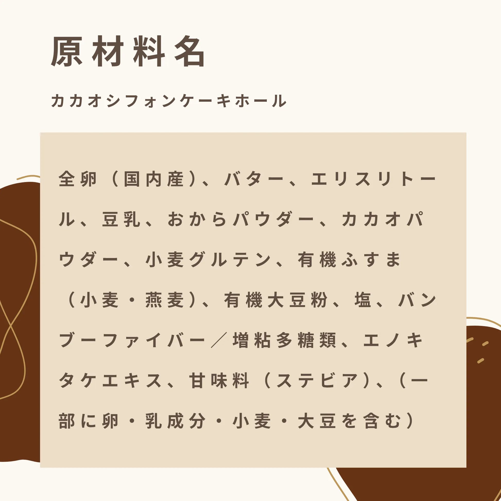 フスボン独自の低糖質ミックス粉とおからパウダーをベースに、香り高いカカオパウダーを加えて丁寧に焼き上げました。糖質は一切れあたりわずか1.1g。国産卵や豆乳、有機ふすま、有機大豆粉など、からだにやさしい素材を使い、エリスリトールとステビアで自然な甘さに仕上げています。