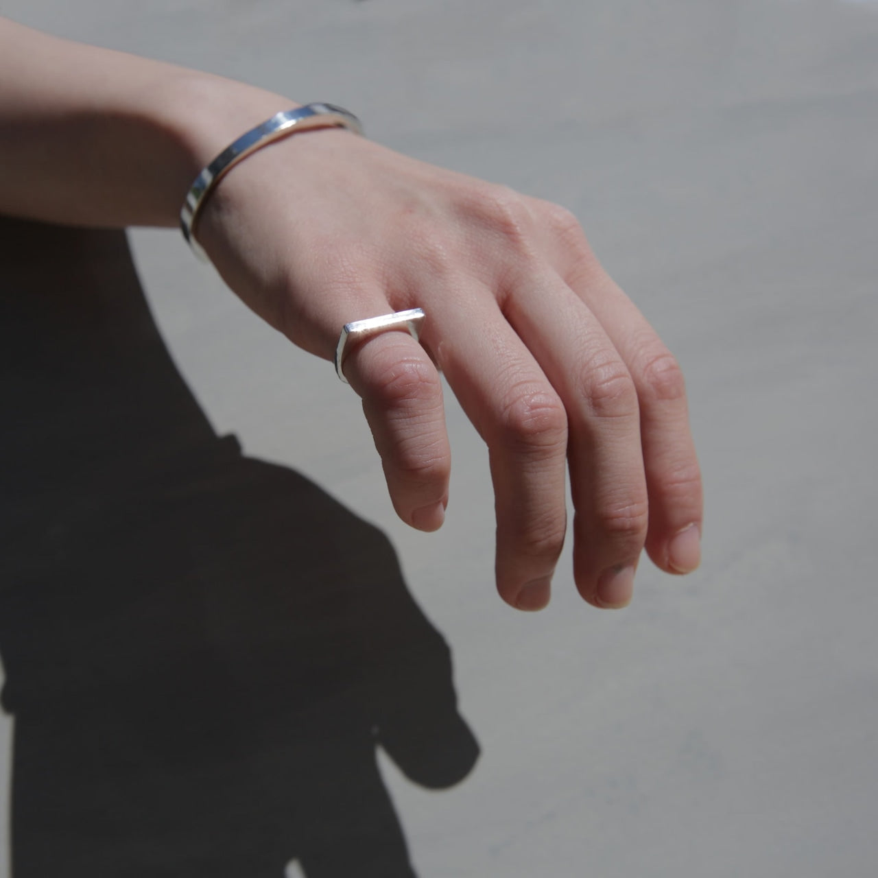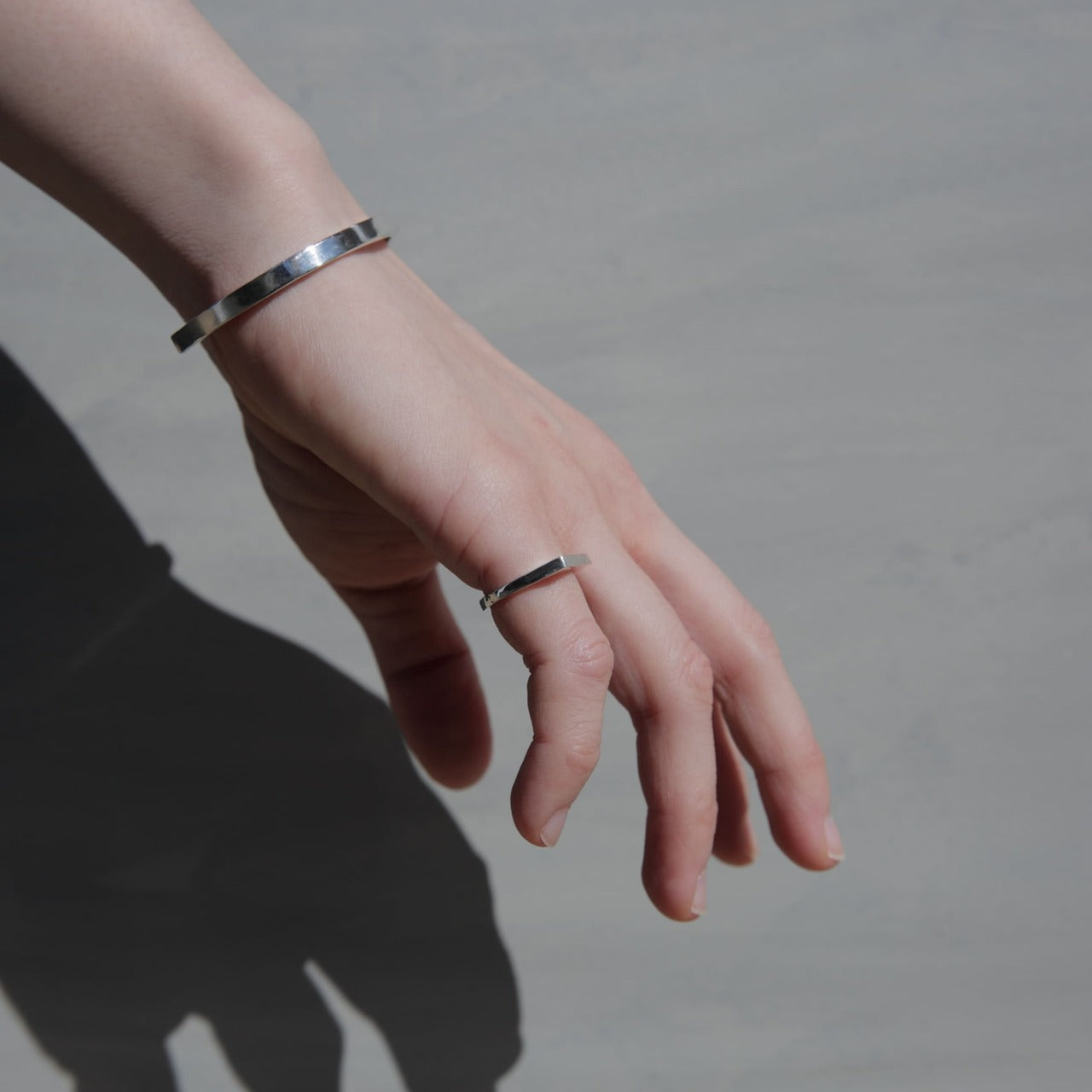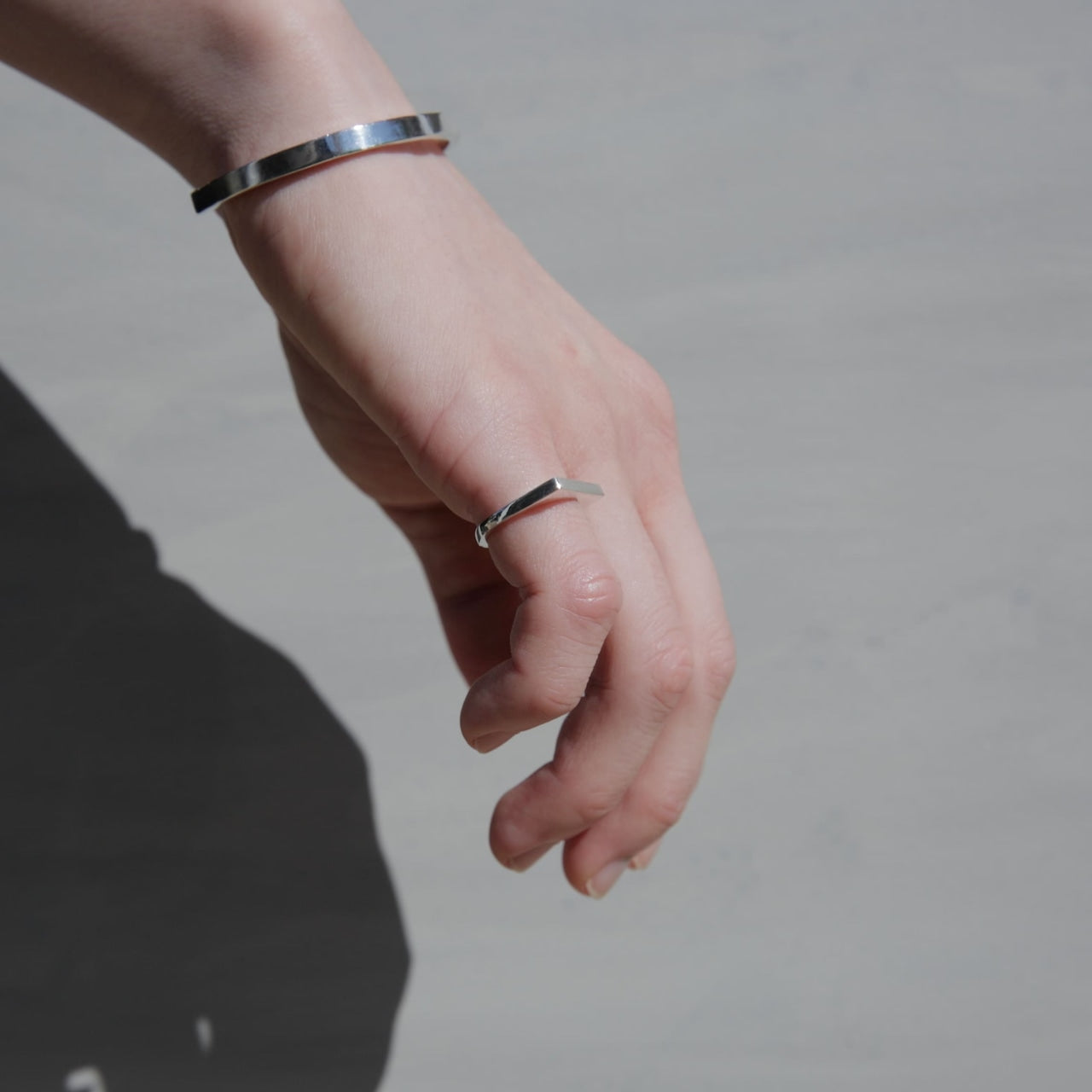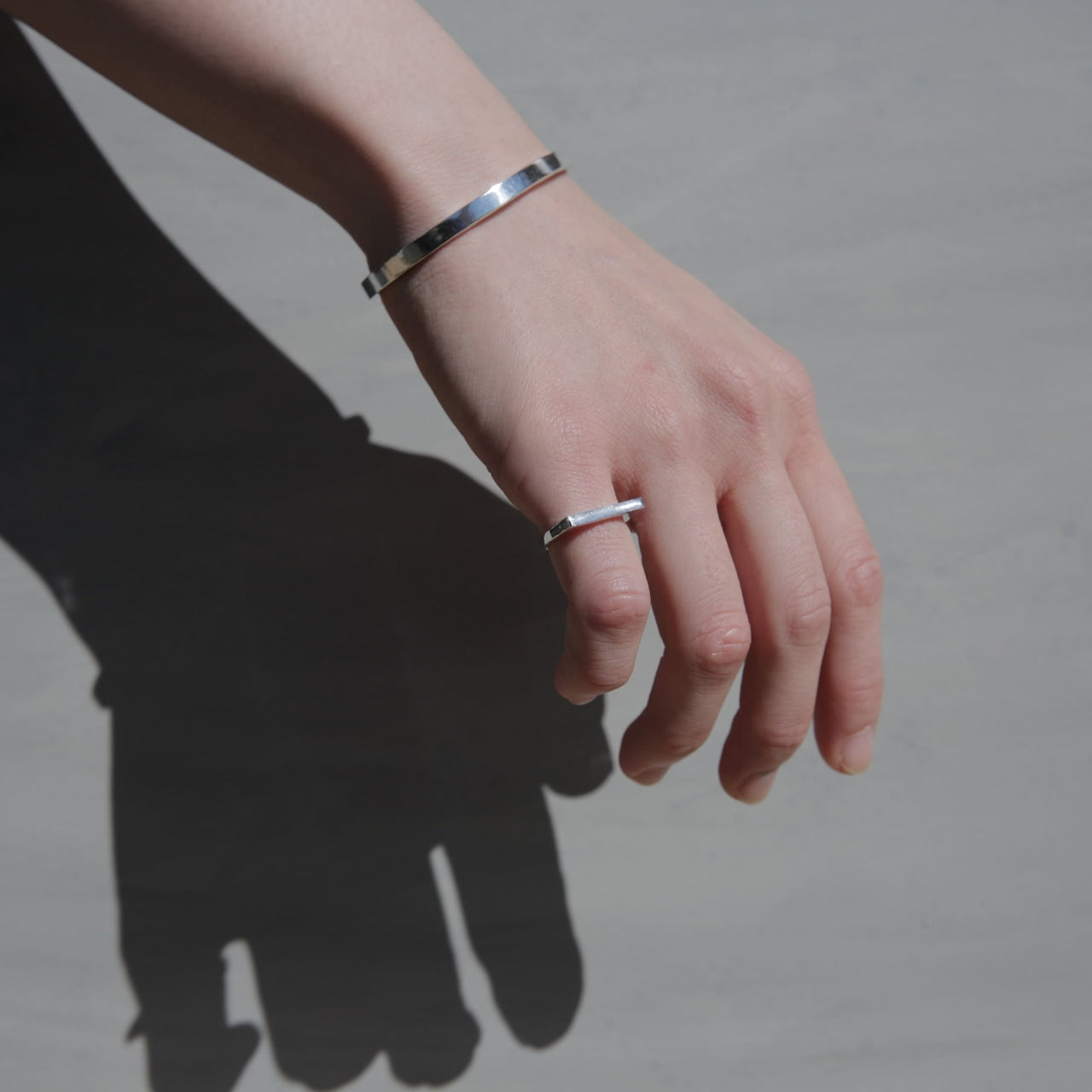 スターリングシルバー(シルバー925)の美しさを活かした、とにかくシンプルなフォルムは、厚み3mmと程よいボリュームでさりげなくスタイリングに馴染んでいきます。