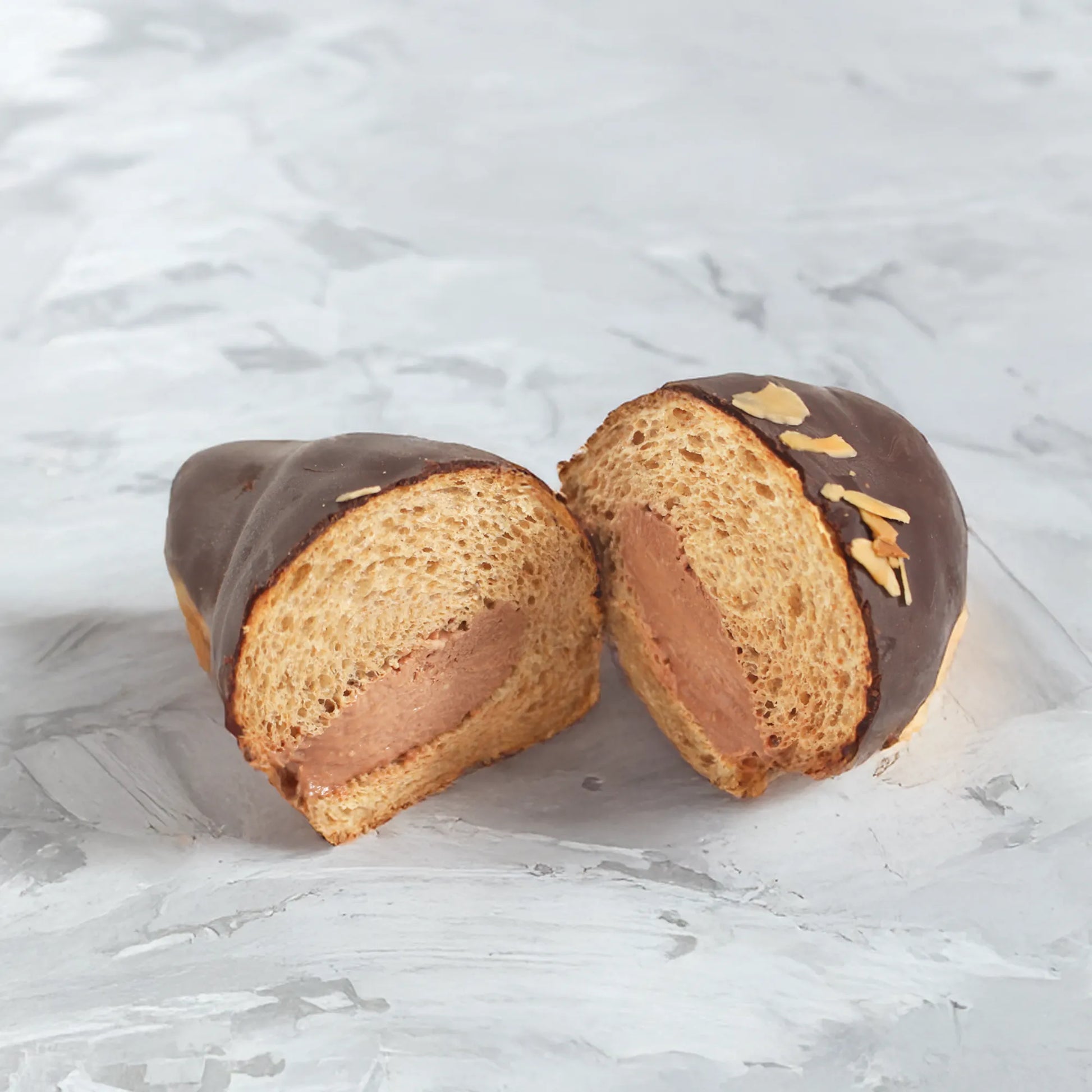 トッピングにはカリッと香ばしいスライスアーモンド。表面をコーティングするビターチョコのつややかさが食欲をそそります。