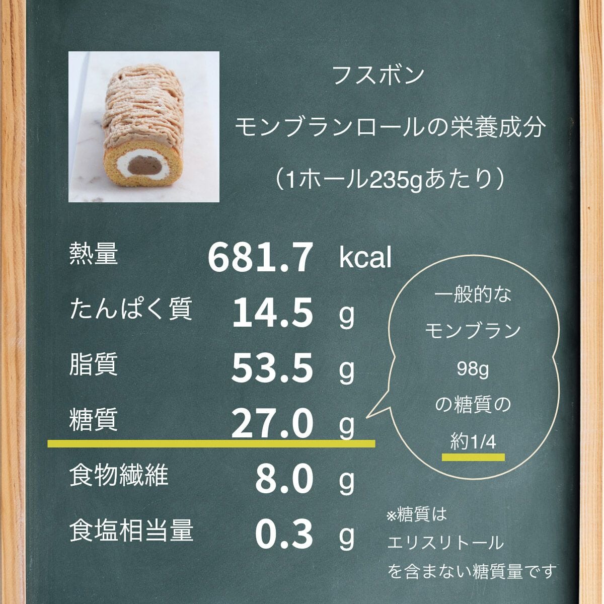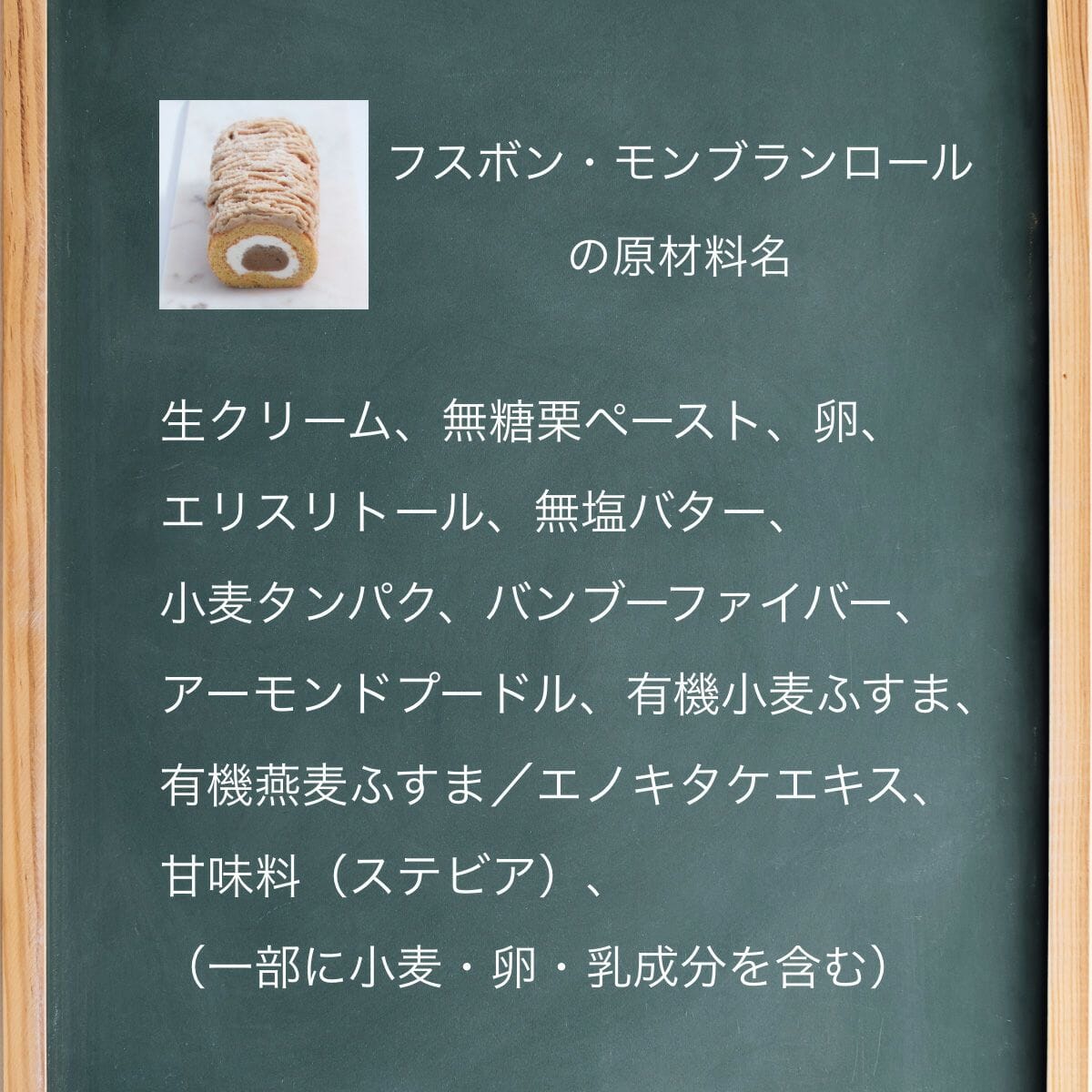 フスボンロールプレーンの生クリームの中にはエリスリトールとステビアで味付けをした栗ペーストを、ケーキの上には栗ペースト、生クリーム、エリスリトール、ステビアからなるモンブランクリームを絞りました。秋の味覚を存分にお楽しみ下さい。