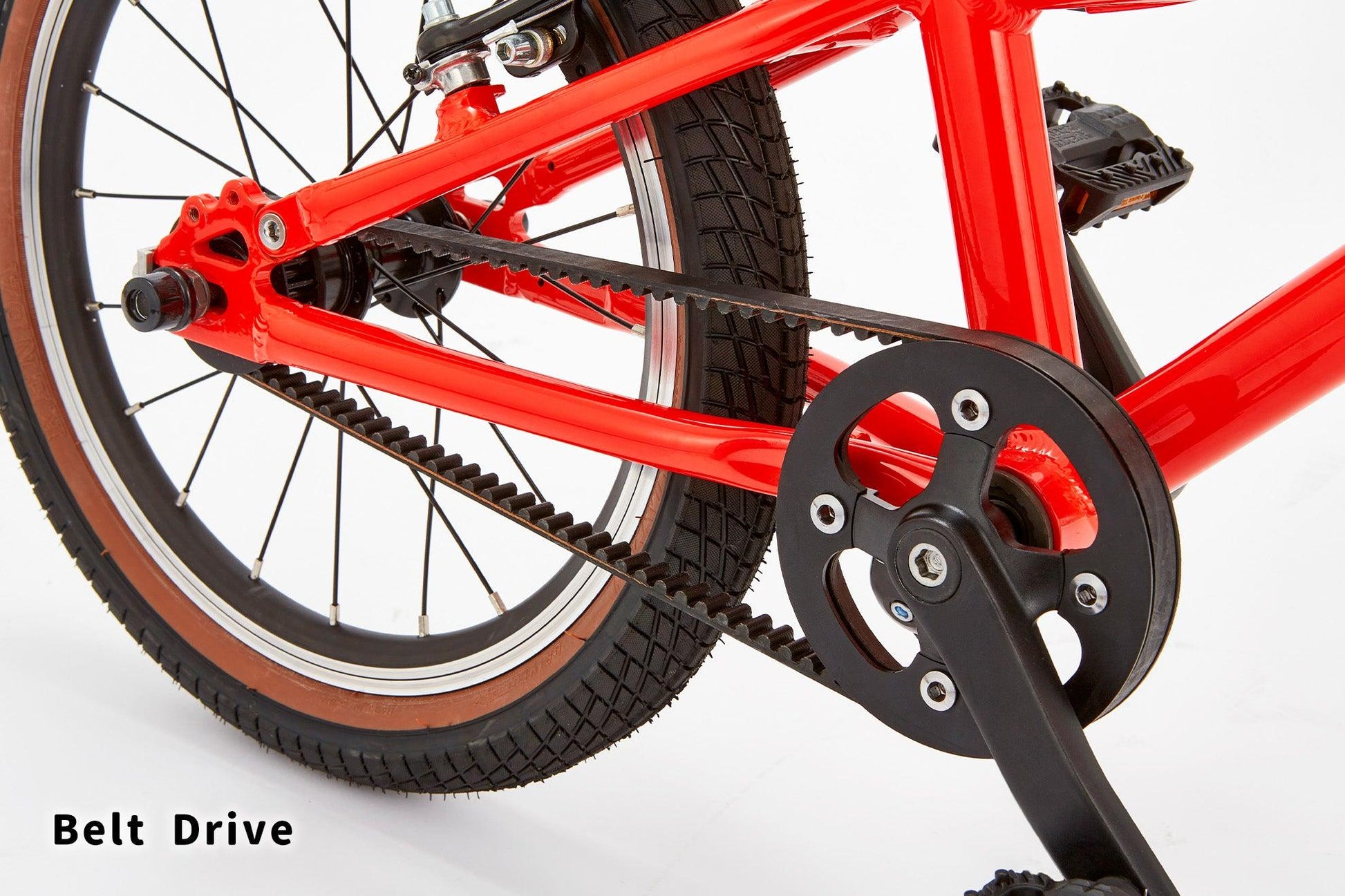 ファーストバイクだからこそ、安全性と扱いやすさにこだわりを。軽量なアルミフレームと巻き込みの心配がないベルトドライブで、はじめてでも安心して乗れます。