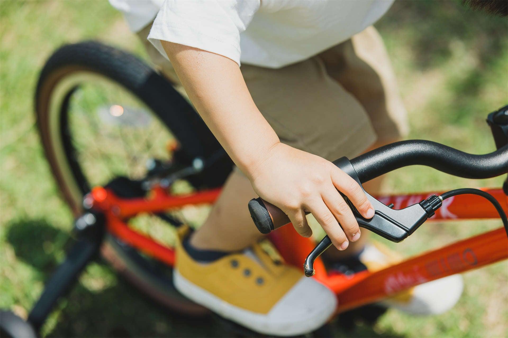 小さなお子さまの力でも握りやすい、調整可能なブレーキレバー。ハンドルグリップにはレザーを使用し、デザイン性もプラスしています。