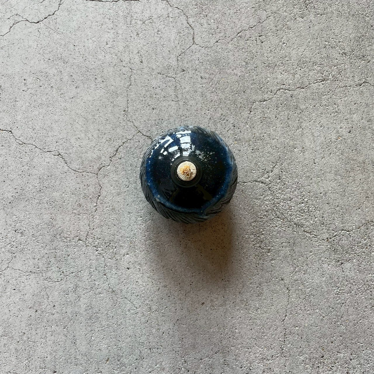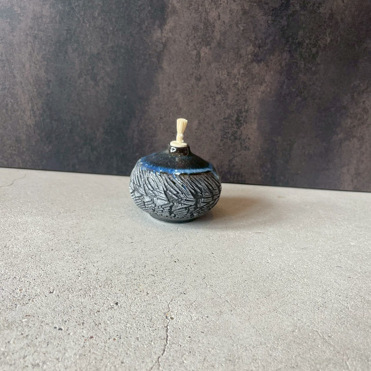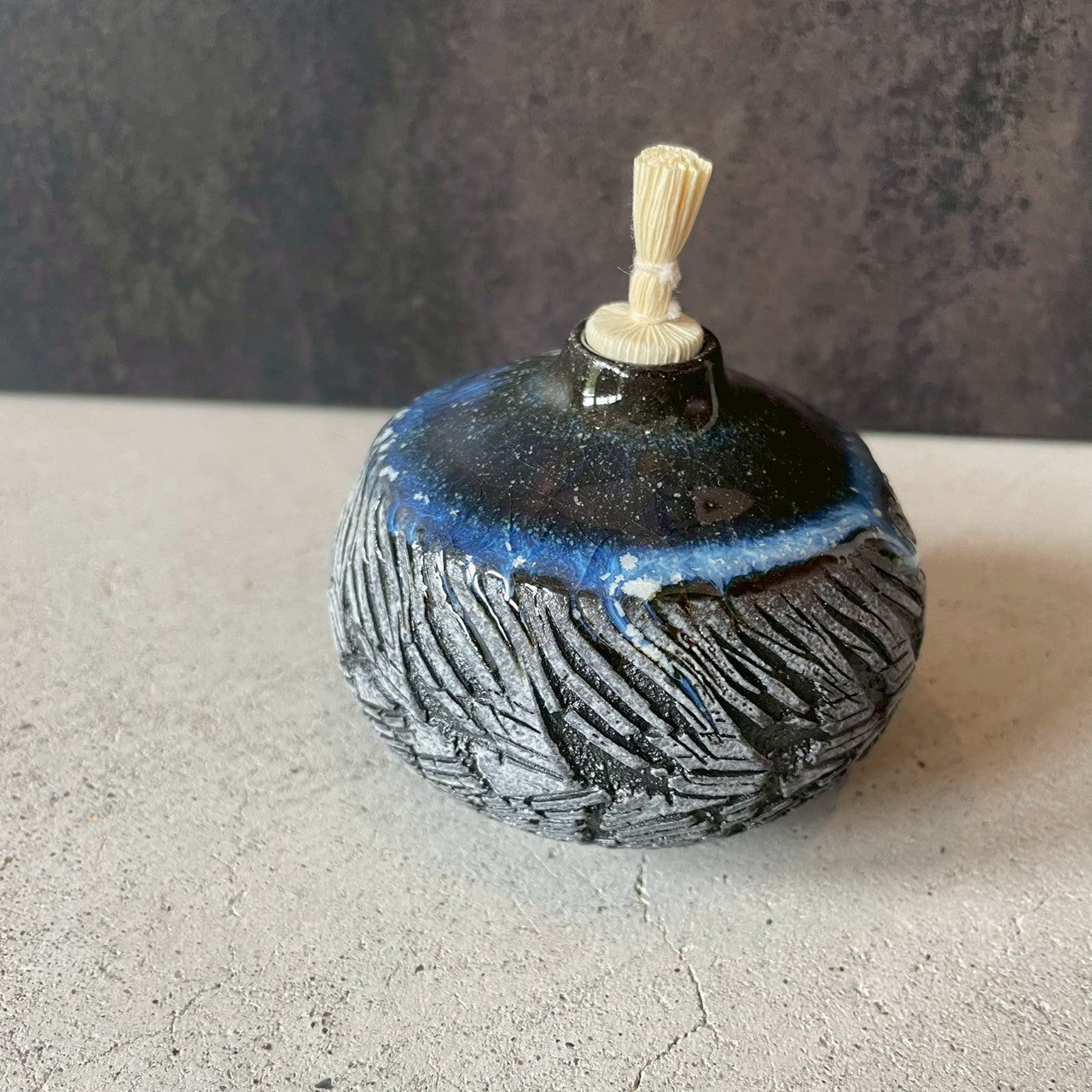表面は、土に模様をつけた後、バーナーで炙り、土が膨張し、崩れ落ちる自然な表現になっています。その上から白色の釉薬をかけ、白と黒のコントラストが出たこの世に1つだけのデザインです。白と黒のコントラストが、しまうまの模様に似ているため、本シリーズはZEBRA(ZB)シリーズと名付けられています。その上から青色の釉薬で彩られ、小宇宙のような雰囲気を醸し出しています。